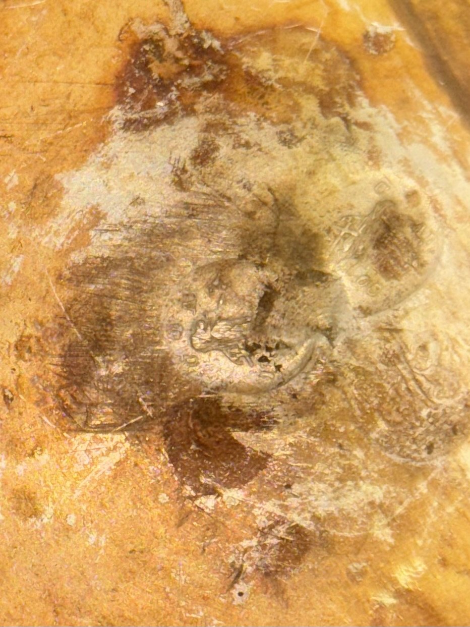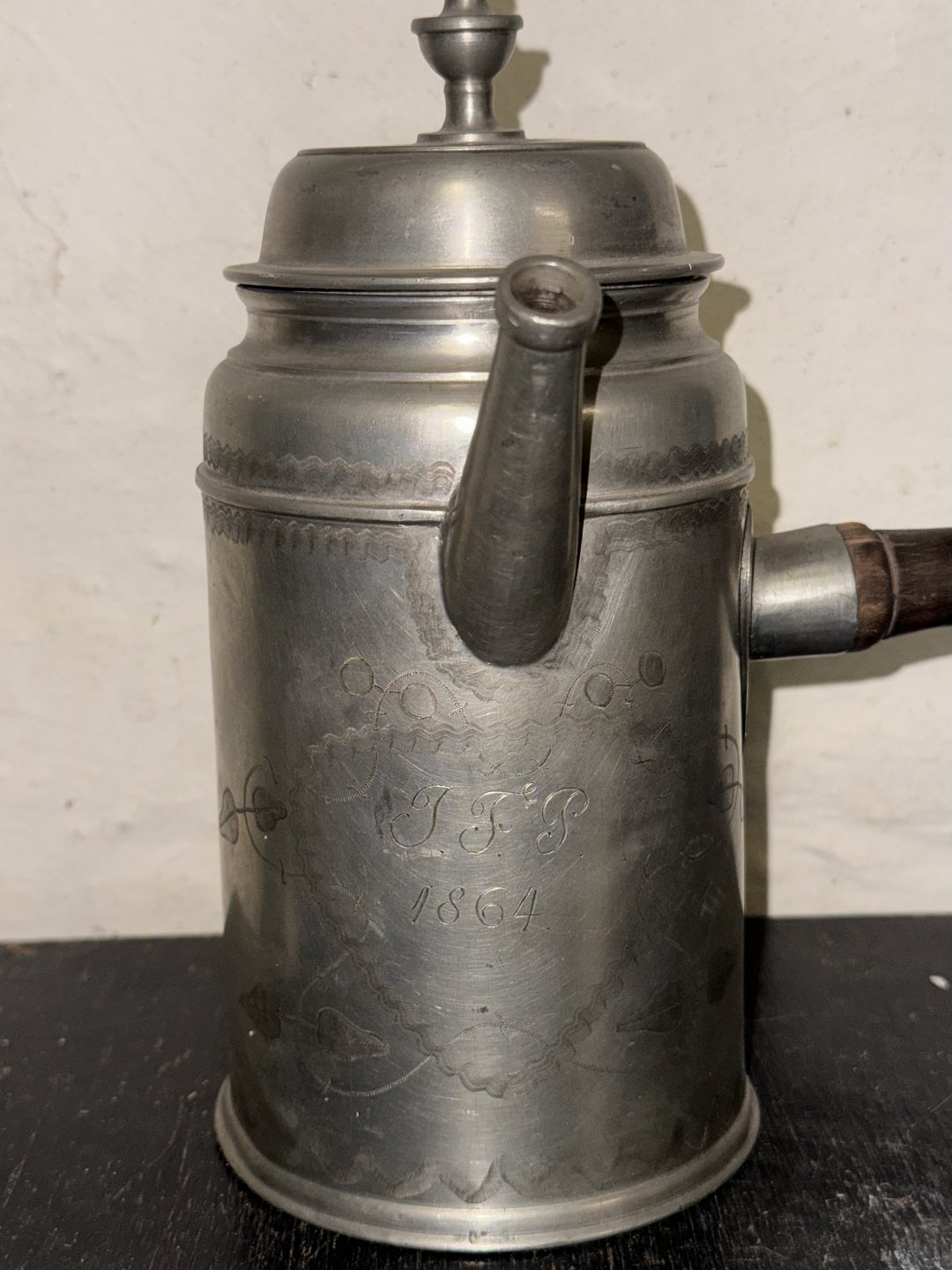 Kaffekande med låg i tin med stjerthåndtag i træ. Indgraveret dekoration på forsiden hvori der ses ejerinitialer samt året 1864. Fremstår i god stand. Stemplet indvendigt på bunden (utydeligt). H. 21,5 cm
