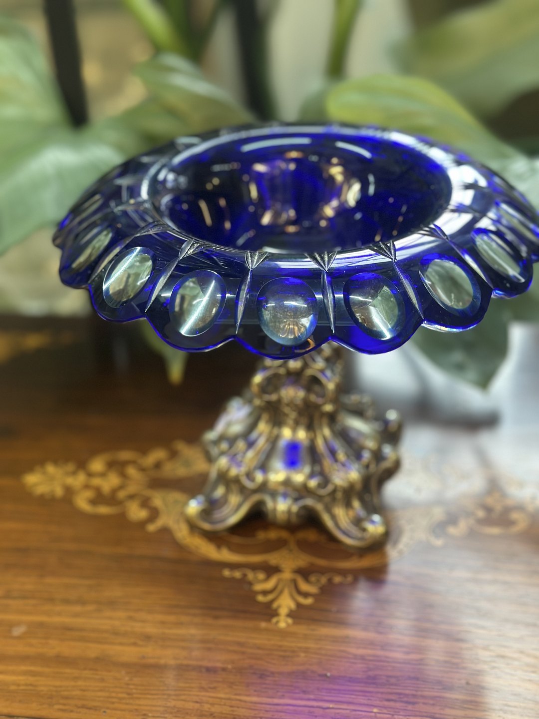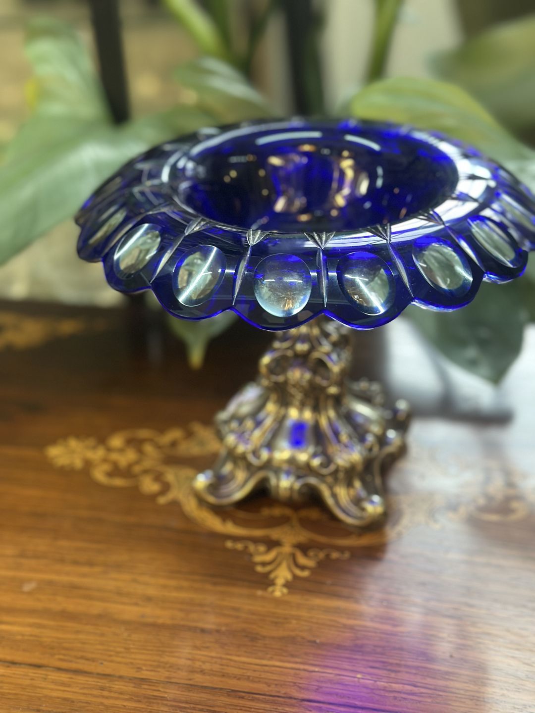 Böhmen Runde Schale mit gewelltem Rand und großer Öffnung auf einem verzierten Metallsockel im Barockstil. Versilbert mit verzierten Akanthusblättern und geschwungenen Füßen Händler