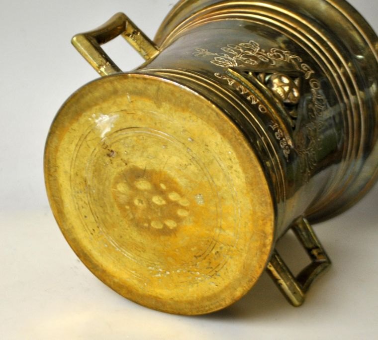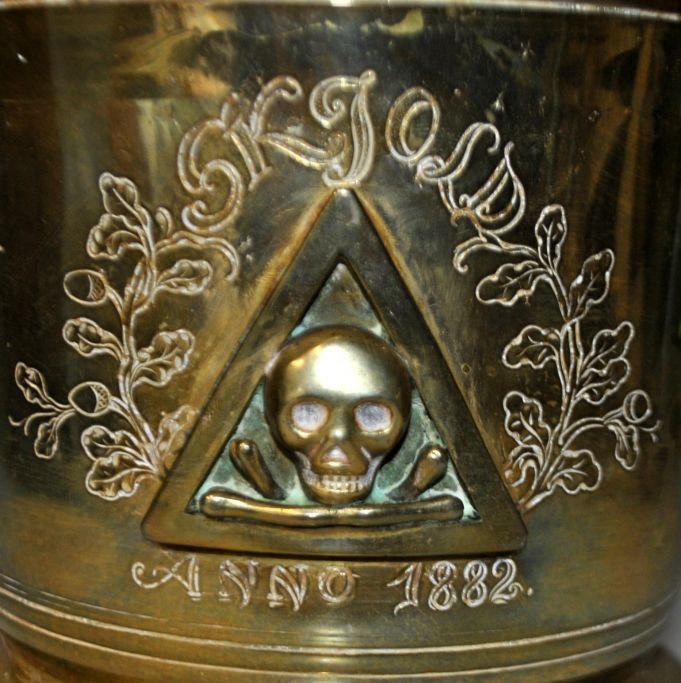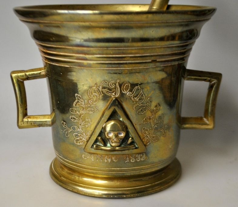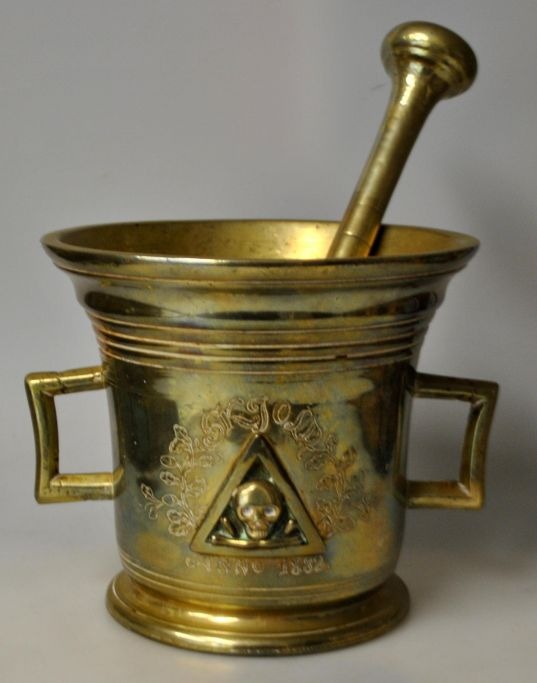 Großer Apothekermörser aus Messing von Svane Apoteket in Randers, 1882. Dänemark. Mit Stößel. Die Seite ist mit einem Dreieck verziert, in dem sich ein Totenkopf mit gekreuzten Knochen befindet. Mit eingraviertem Dekor und dem Namen: Skjold anno. 1882. Höhe: 15 cm. Durchmesser Öffnung: 17 cm. Länge Stößel: 25,5 cm.Traumhaft schöne Arbeit, wie man sieht, war im Einsatz. Später wohl nur noch als Dekoration verwendet.