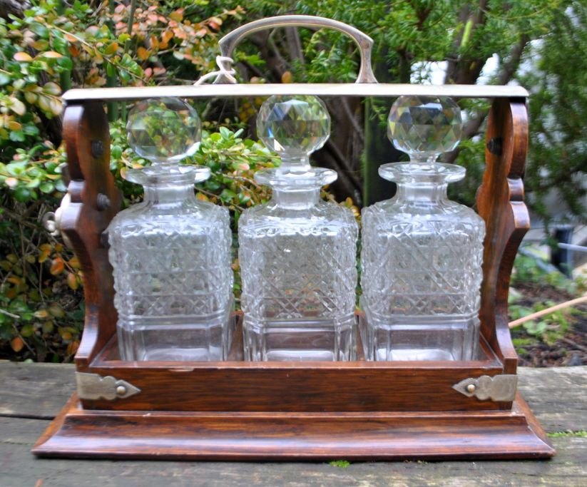 Tantalus aus Eiche mit drei Kristallkaraffen mit Stöpseln. England. 19. Jahrhundert. Mit Messingbeschlägen und -griff. Öffnung im Griff mit Schloss und Schlüssel. L: 37 cm. H: 30 cm.Bestellnummer: 28419