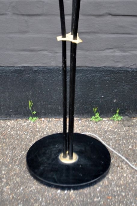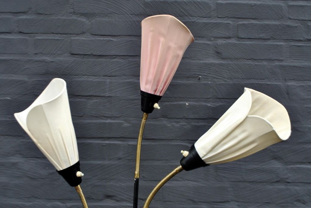 Borëns, Borås Stehleuchte Modell 7297, 1950-60er Jahre. Schweden. Rahmen aus Eisen mit Messing. Lampenschirme aus Stoff, zwei in Weiß, einer in Rosa. H: 180 cm. Durchmesser: 30 cm.Bestellnummer: 28421