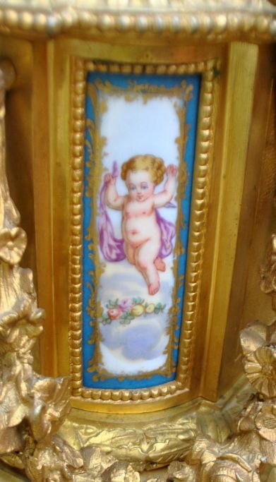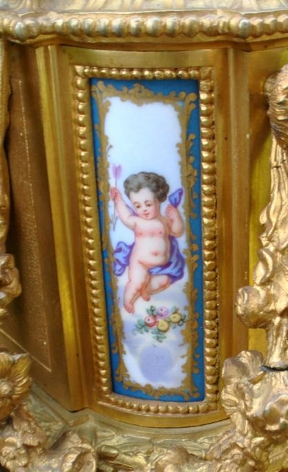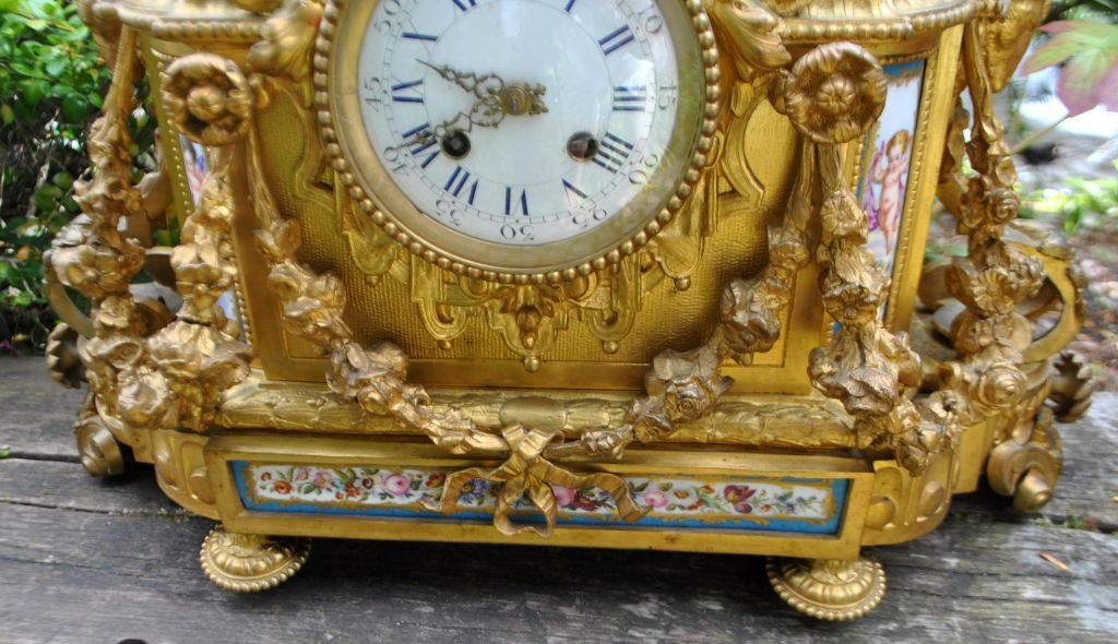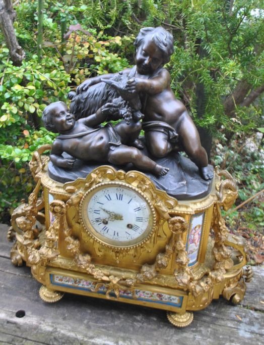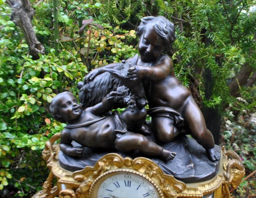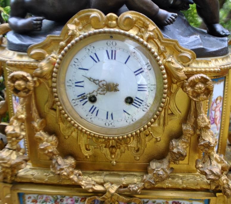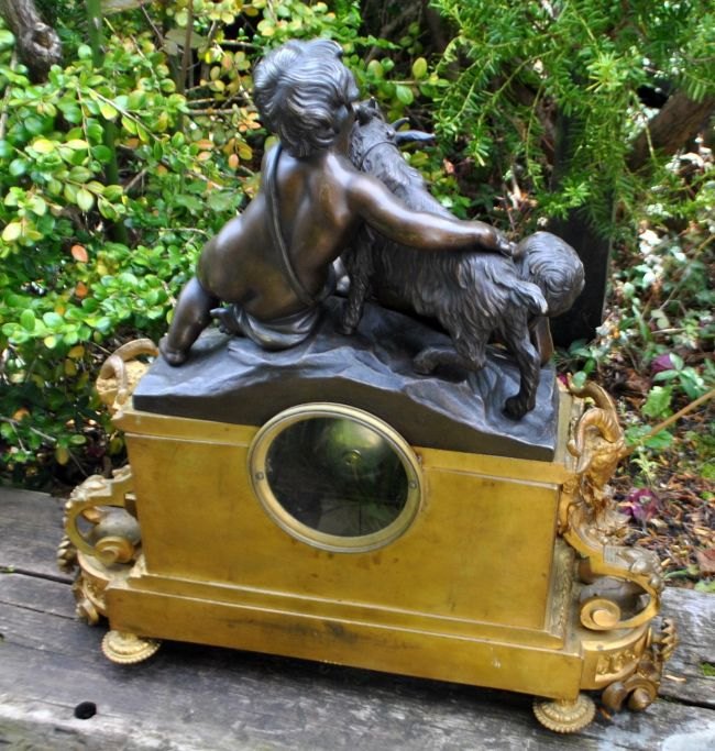 Große französische Kaminuhr aus Bronze, frühes 19. Jahrhundert. Aufsatzdekoration in Form von zwei Putti und einem Ziegenbock. Uhrengehäuse aus vergoldeter Bronze mit Girlanden und Widderköpfen. Porzellanplaketten mit Blumen und Putti. Weißes Emailzifferblatt mit römischen und arabischen Ziffern. Standarduhrwerk mit Schnuraufhängung.Bestellnummer: 28431