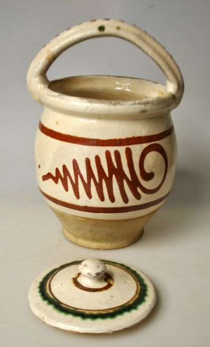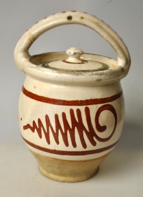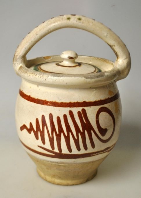 Antiker dänischer Mutterschaftstopf aus glasiertem rotem Ton, 19. Jahrhundert. Mit weißer Unterglasur und roten und grünen Überglasuren. H.: 21 cm.Bestellnummer: 28432
