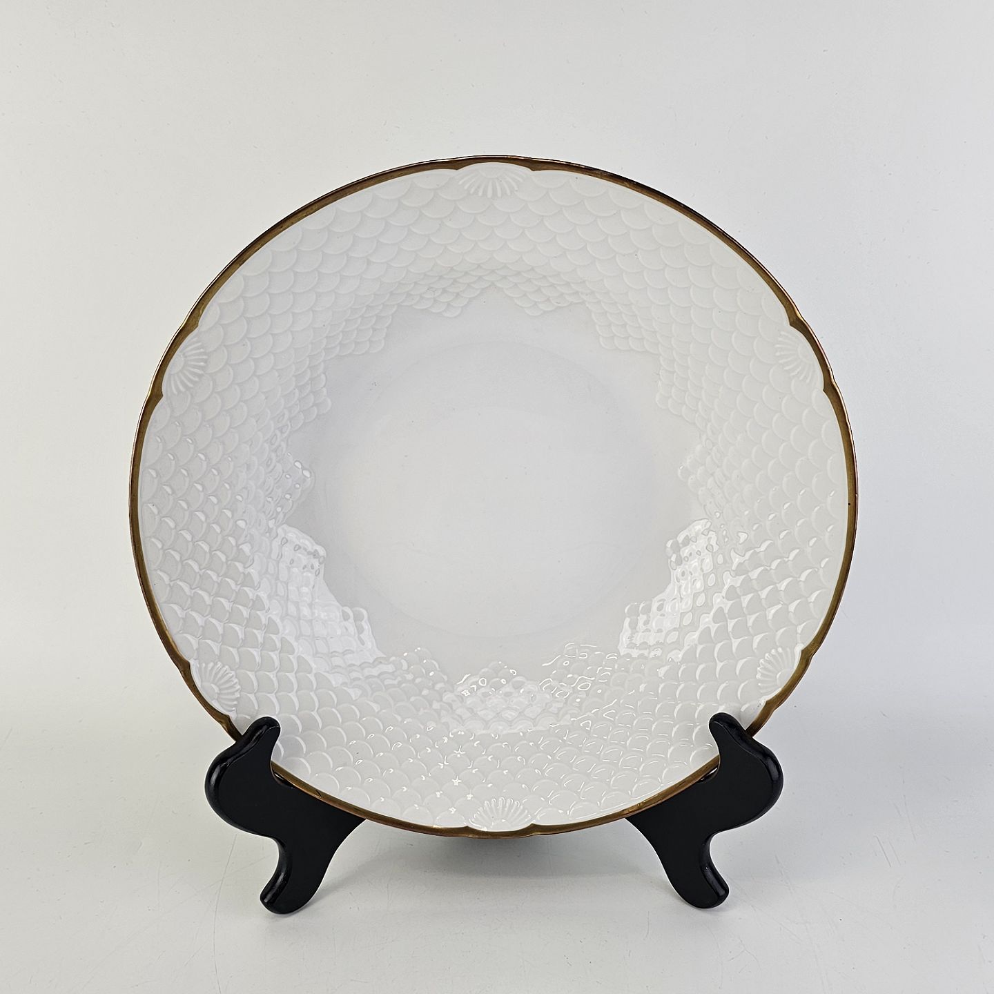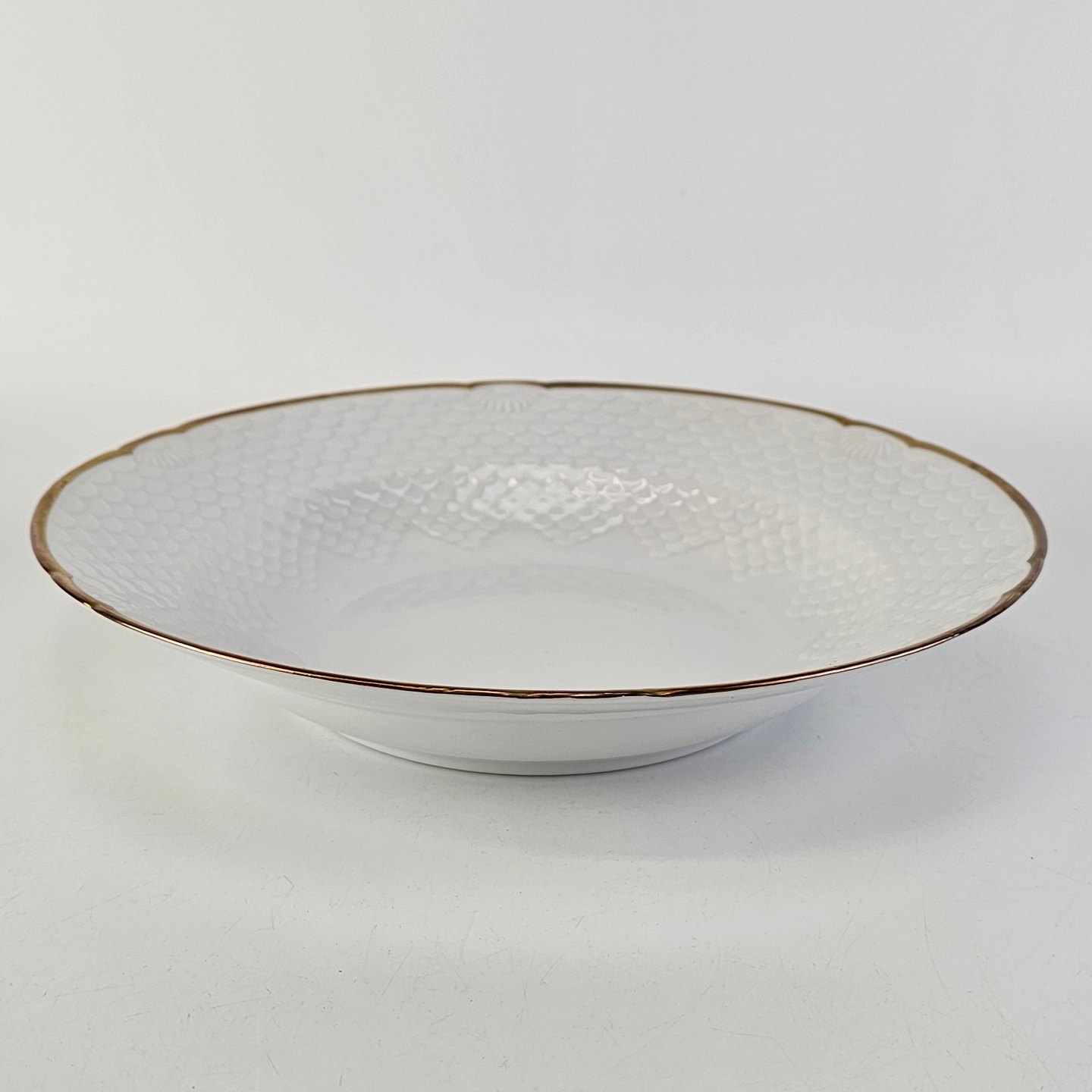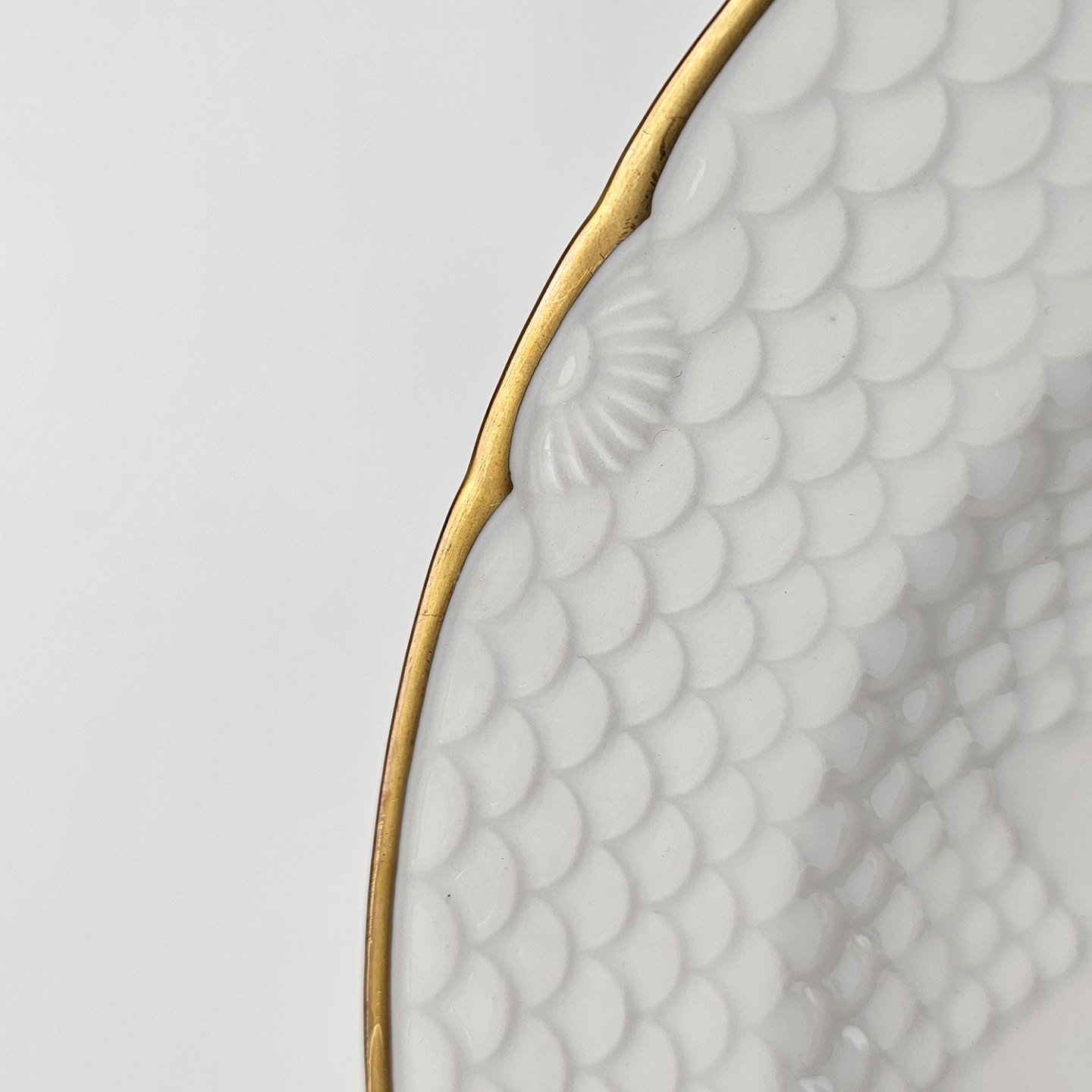 Service i lyst porcelæn med skælform og gylden kant