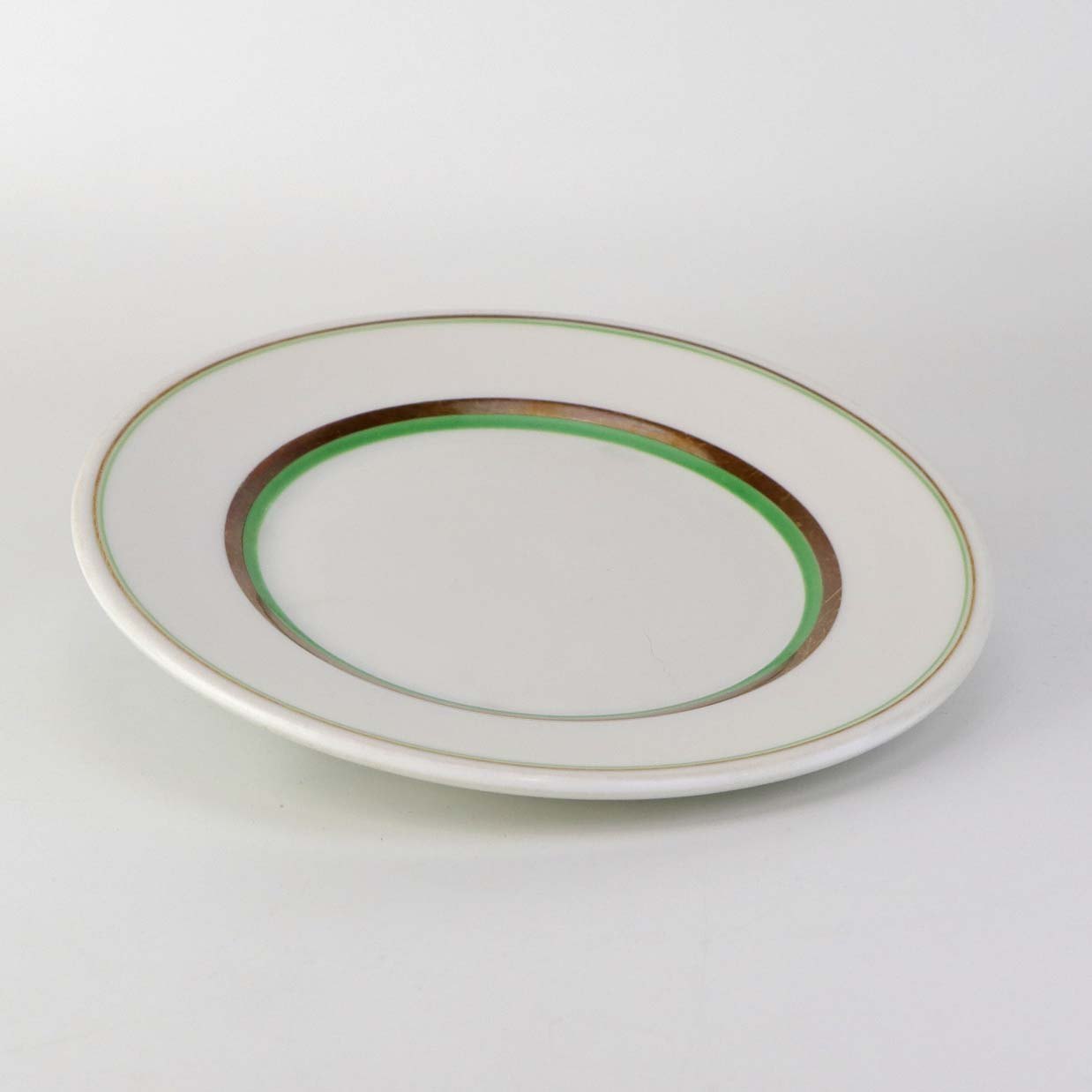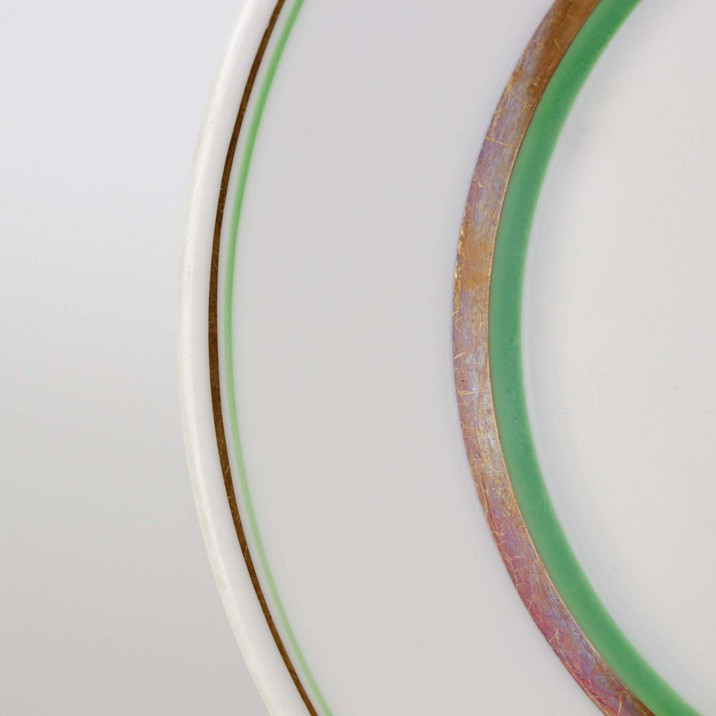Service i glat hvidt porcelæn med dekoration i grøn og gylden streg.