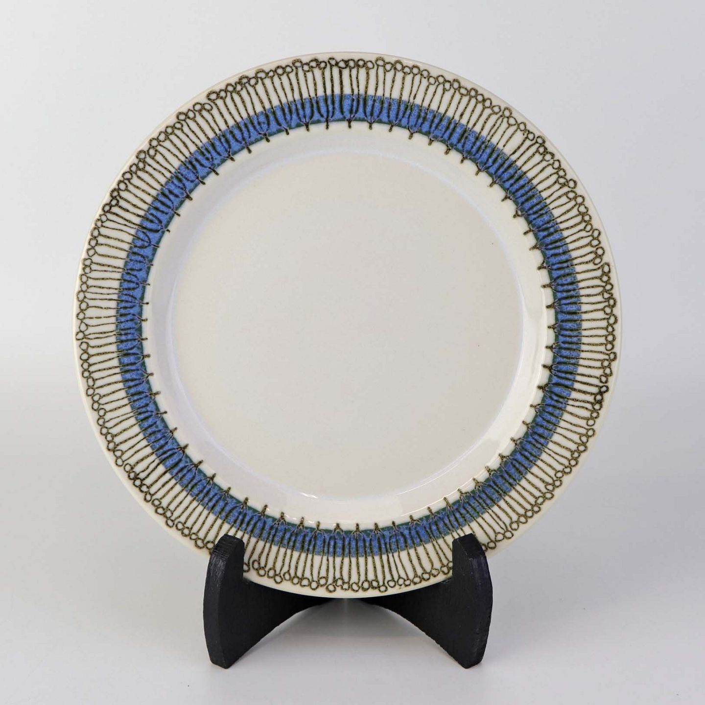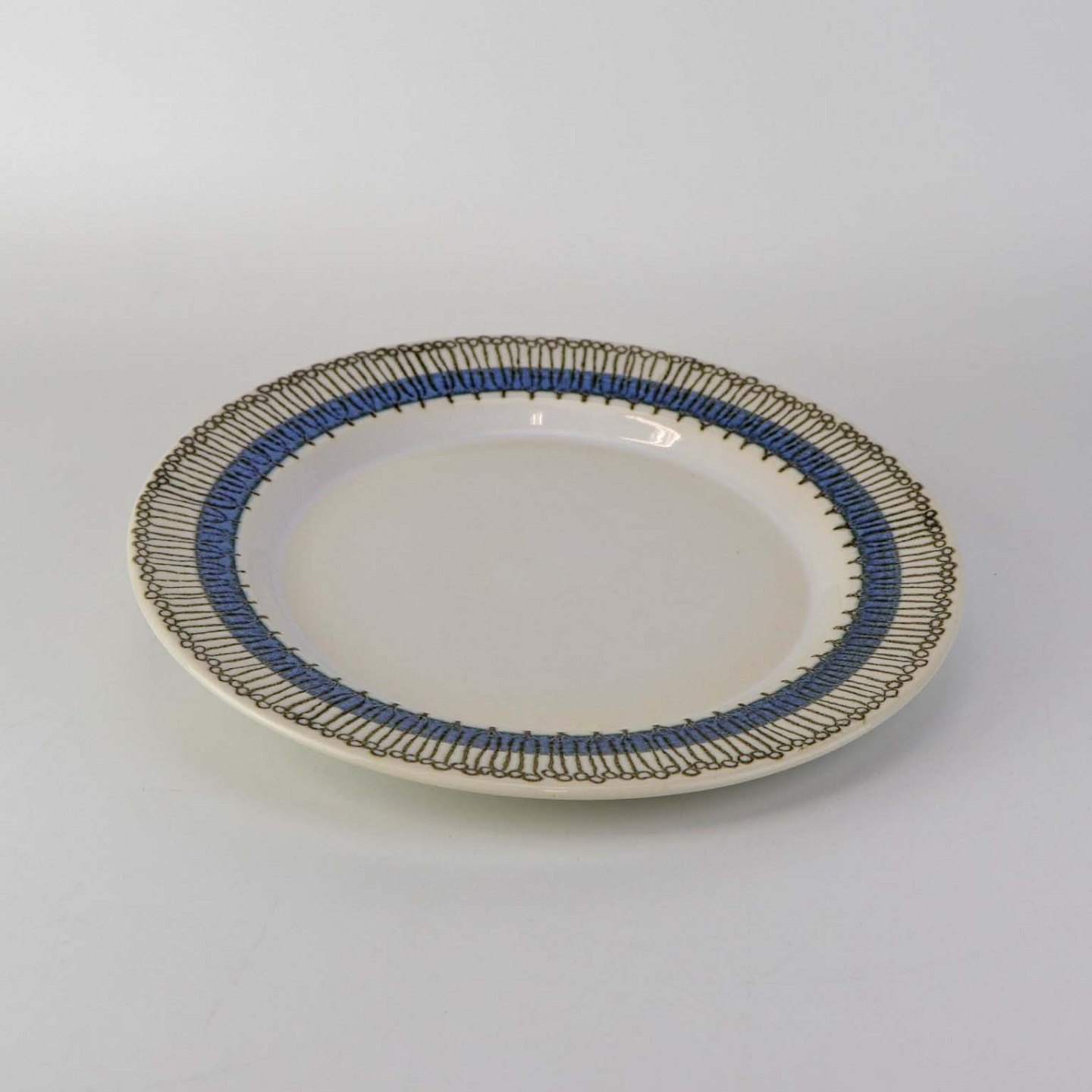 Service i lys fajance dekoreret med abstrakt mønster i sort streg over blå bort.