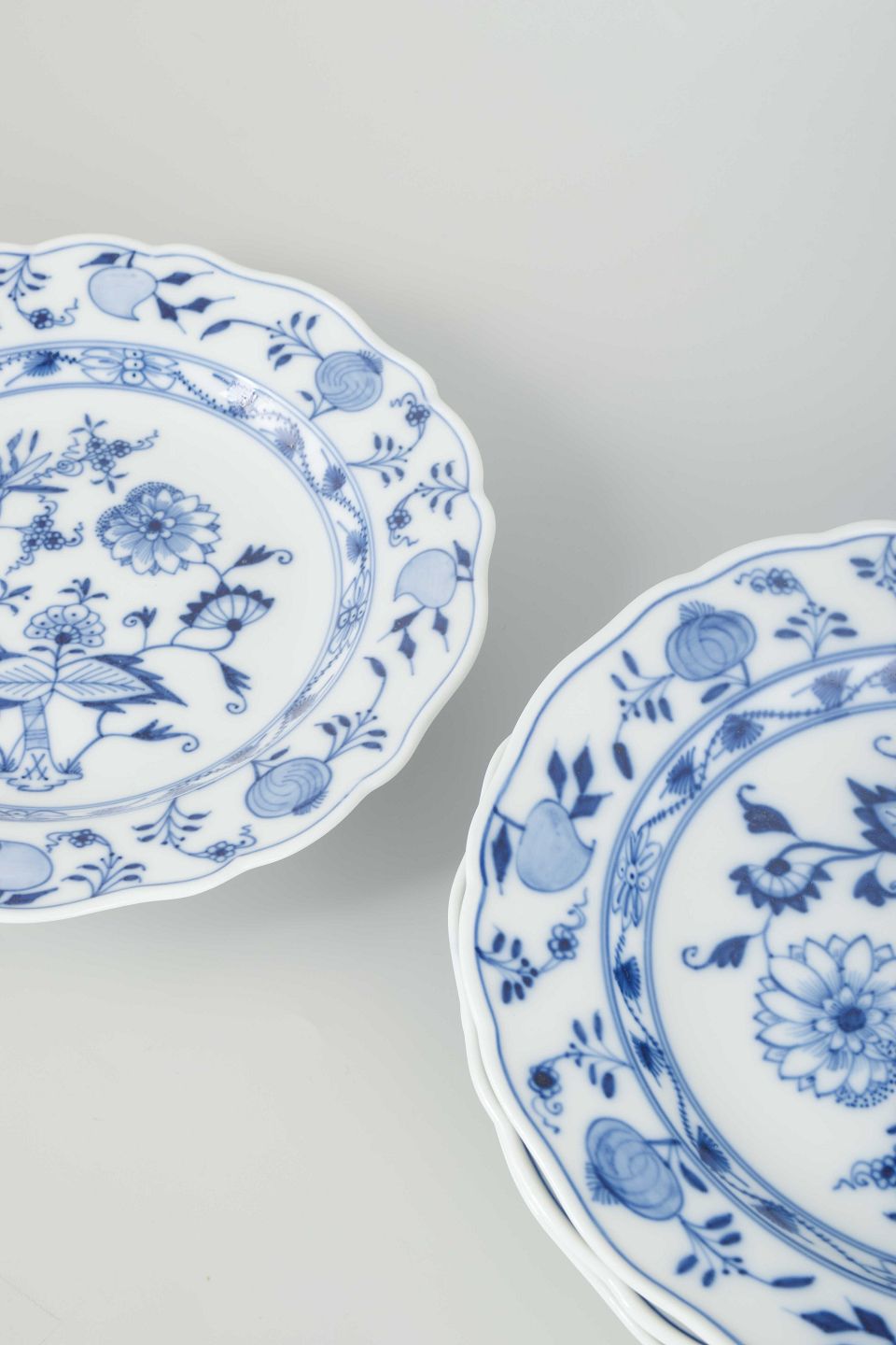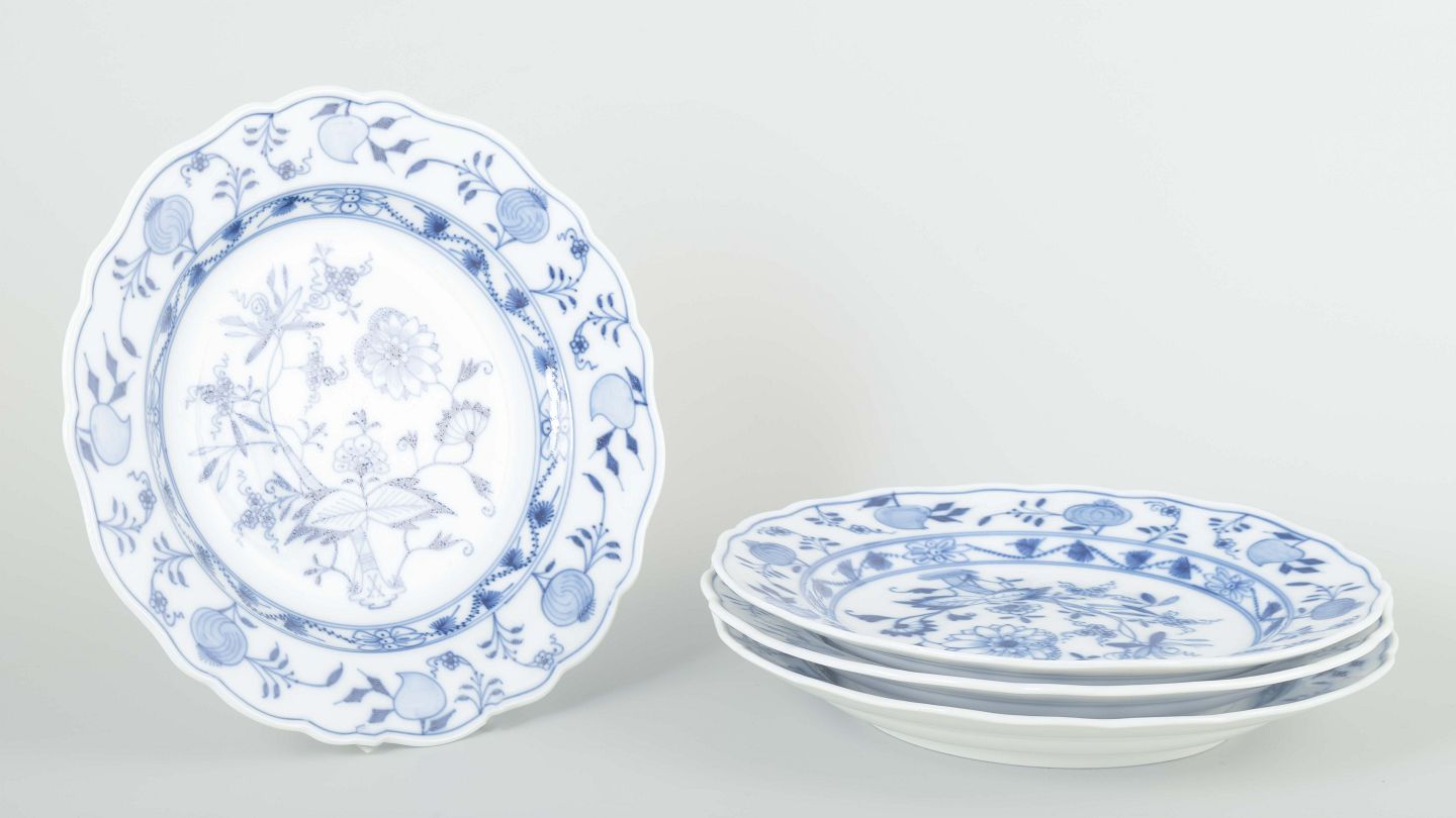 Meissen4 middagstallerkener, “Løgmønstret”, midten af 1900-tallet.