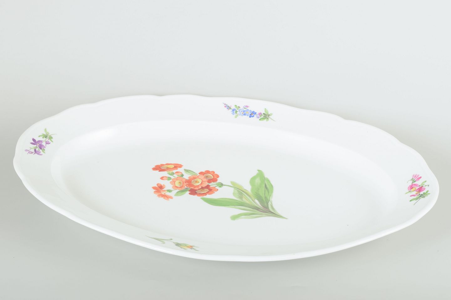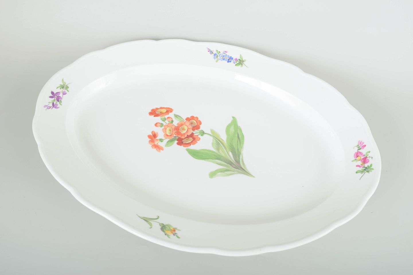 Elegant serveringsfad i porcelæn, håndmalet med blomsterdekorationer i flerfarvet palet. Klassisk bølget kantprofil med relief og fin staffering.