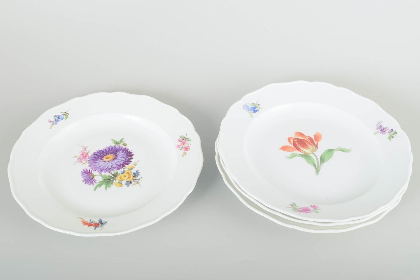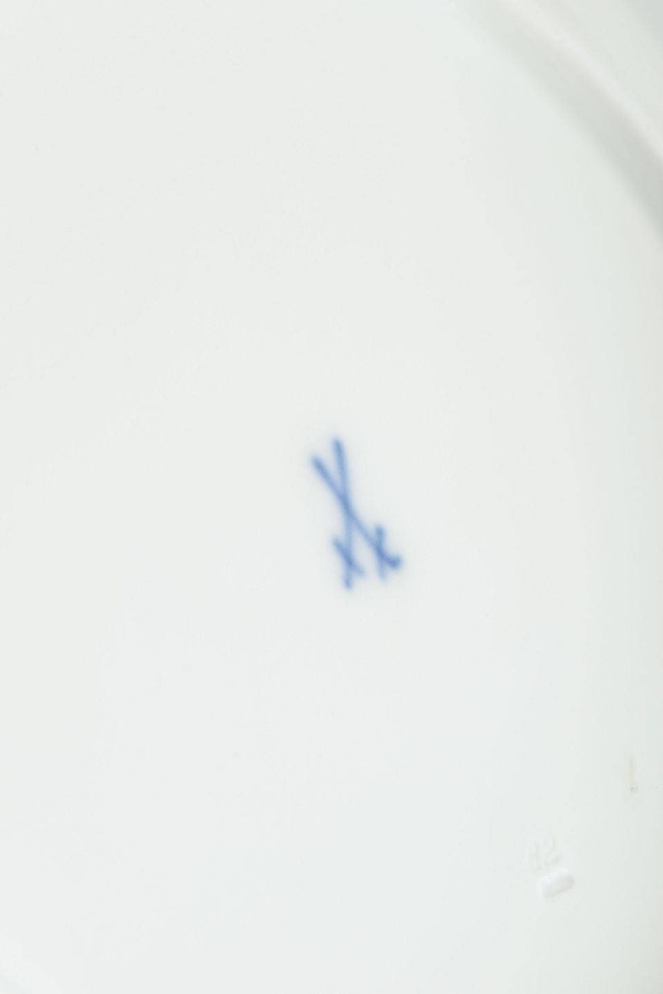 Stand: Flot stand med lette brugsspor. Én tallerken i 1. sortering, tre annulleret med to indridsede streger. Alle tallerkener stemplet med Meissens korslagte sværd.