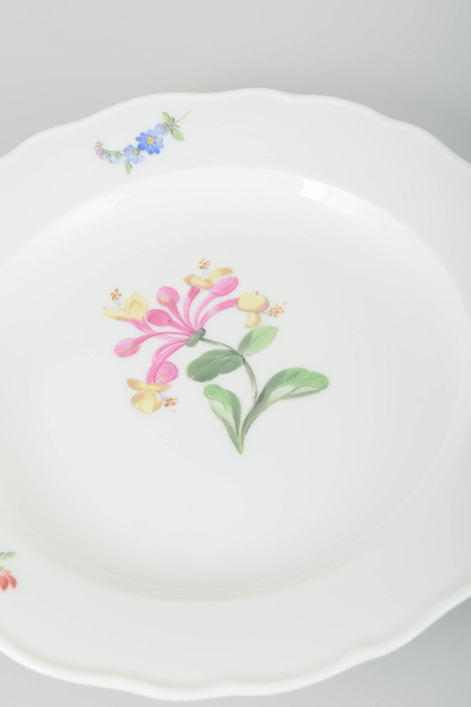 Meissen har siden begyndelsen af 1700-tallet været Europas førende porcelænsfabrik, kendt for sin håndmalede dekoration og tekniske perfektion. Blomsterdekorationerne, ofte inspireret af naturstudier, blev et symbol på manufakturens klassiske stil og håndværksmæssige kvalitet.