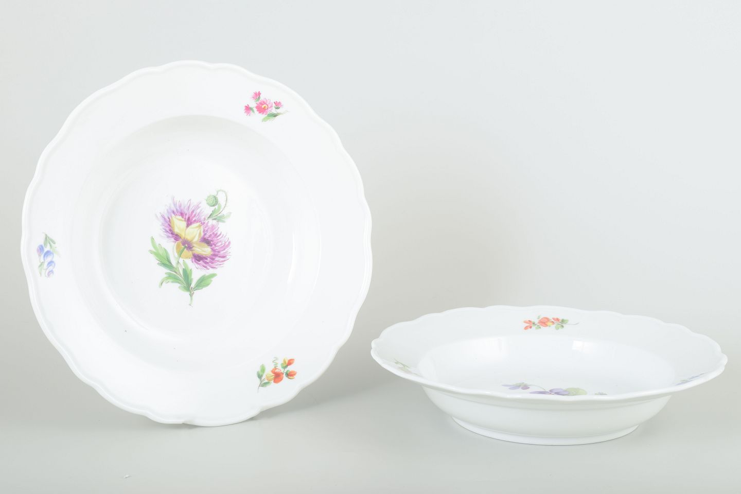 To dybe tallerkener i porcelæn, håndmalede med blomsterdekorationer i flerfarvet palet. Klassisk bølget kantprofil med relief og delikat staffering.