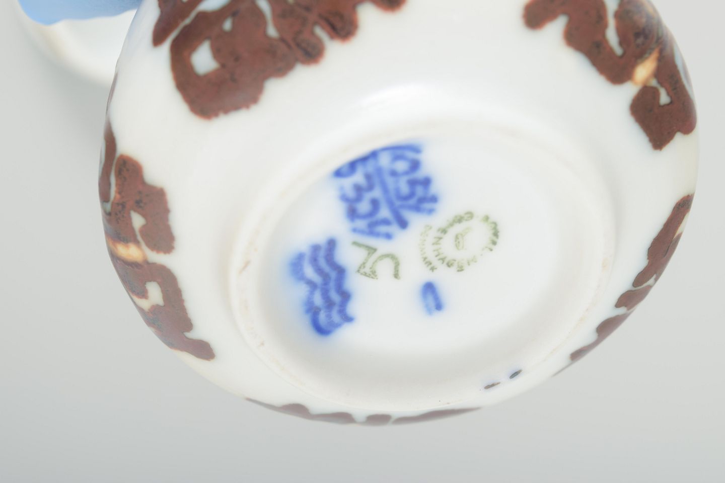 Lille lågkrukke i porcelæn med hvid glasur og abstrakt, reliefagtig dekoration i brunlige og turkise nuancer. Et sjældent og kunstnerisk studiostykke fra Royal Copenhagens eksperimenterende periode i 1960’erne, hvor fabrikkens designere arbejdede med nye glasur- og farveteknikker.