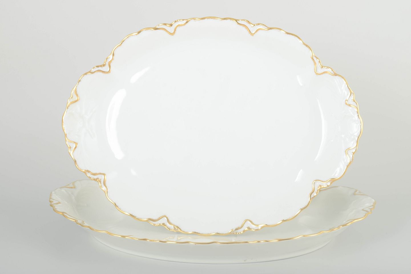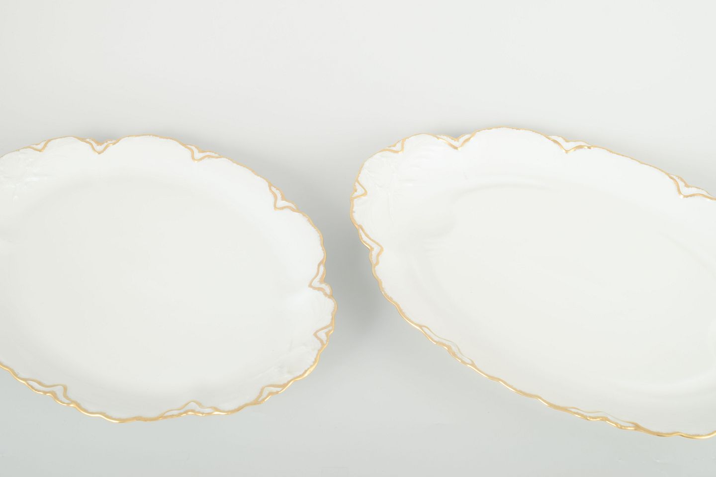 Elegant sæt ovale fade i cremefarvet porcelæn med håndmalet guldkant og svungne profilerede former. Klassisk fransk design i tidstypisk art deco-inspireret udtryk.