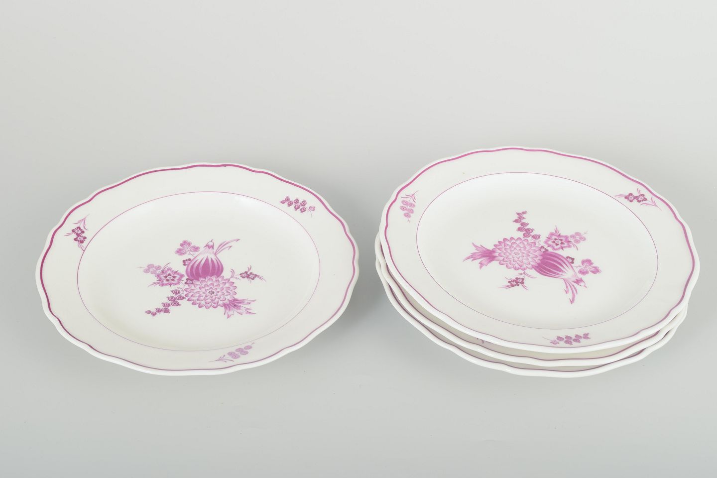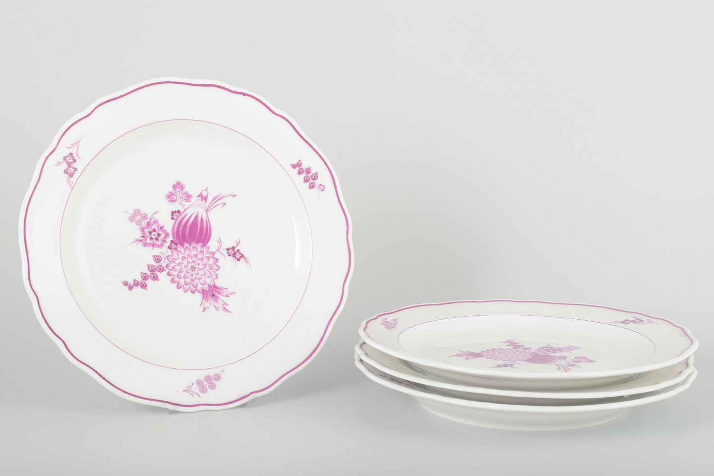 Sæt af fire håndmalede frokosttallerkener i porcelæn med dekor i lilla blomsterkompositioner og let bølget kant. Klassisk Meissen-design med elegant staffering i rosa toner.