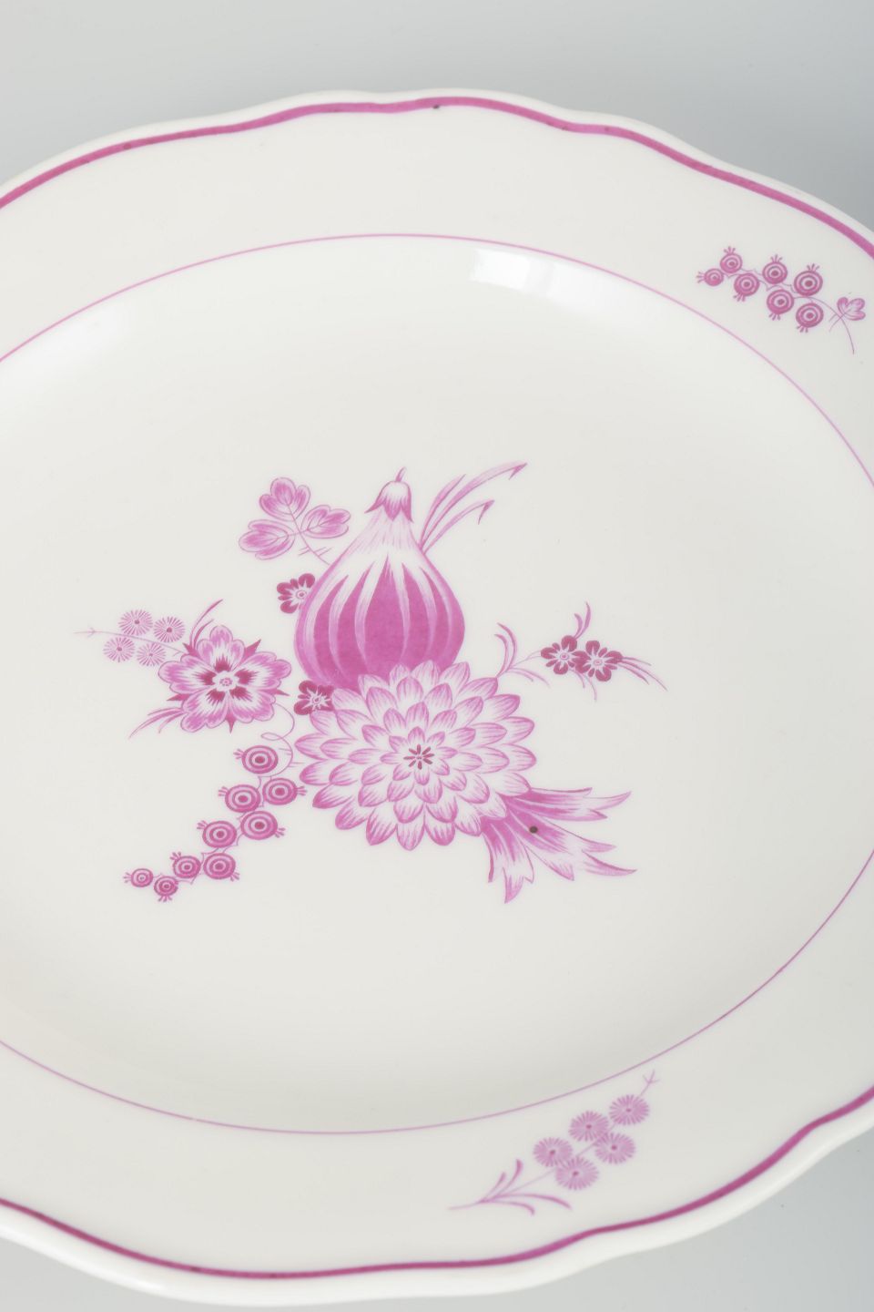 Meissen har siden begyndelsen af 1700-tallet været Europas førende porcelænsfabrik, kendt for sin håndmalede dekoration og tekniske perfektion. I 1930’erne blev de klassiske blomsterdekorer genfortolket i mere afdæmpede farver, som her i lilla, hvilket giver et elegant og tidstypisk udtryk.