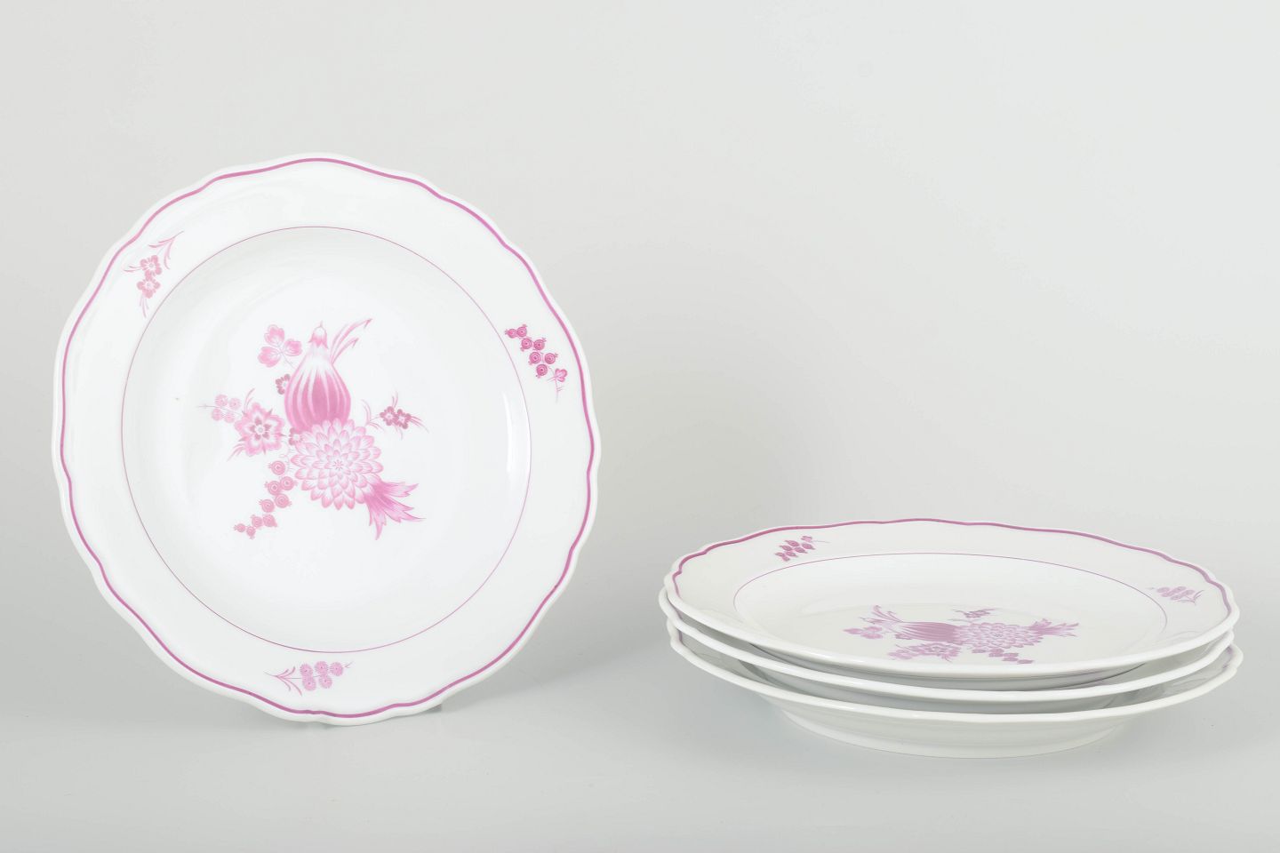 Sæt af fire håndmalede frokosttallerkener i porcelæn med dekor i lilla blomsterkompositioner og let bølget kant. Klassisk Meissen-design med elegant staffering i rosa toner.
