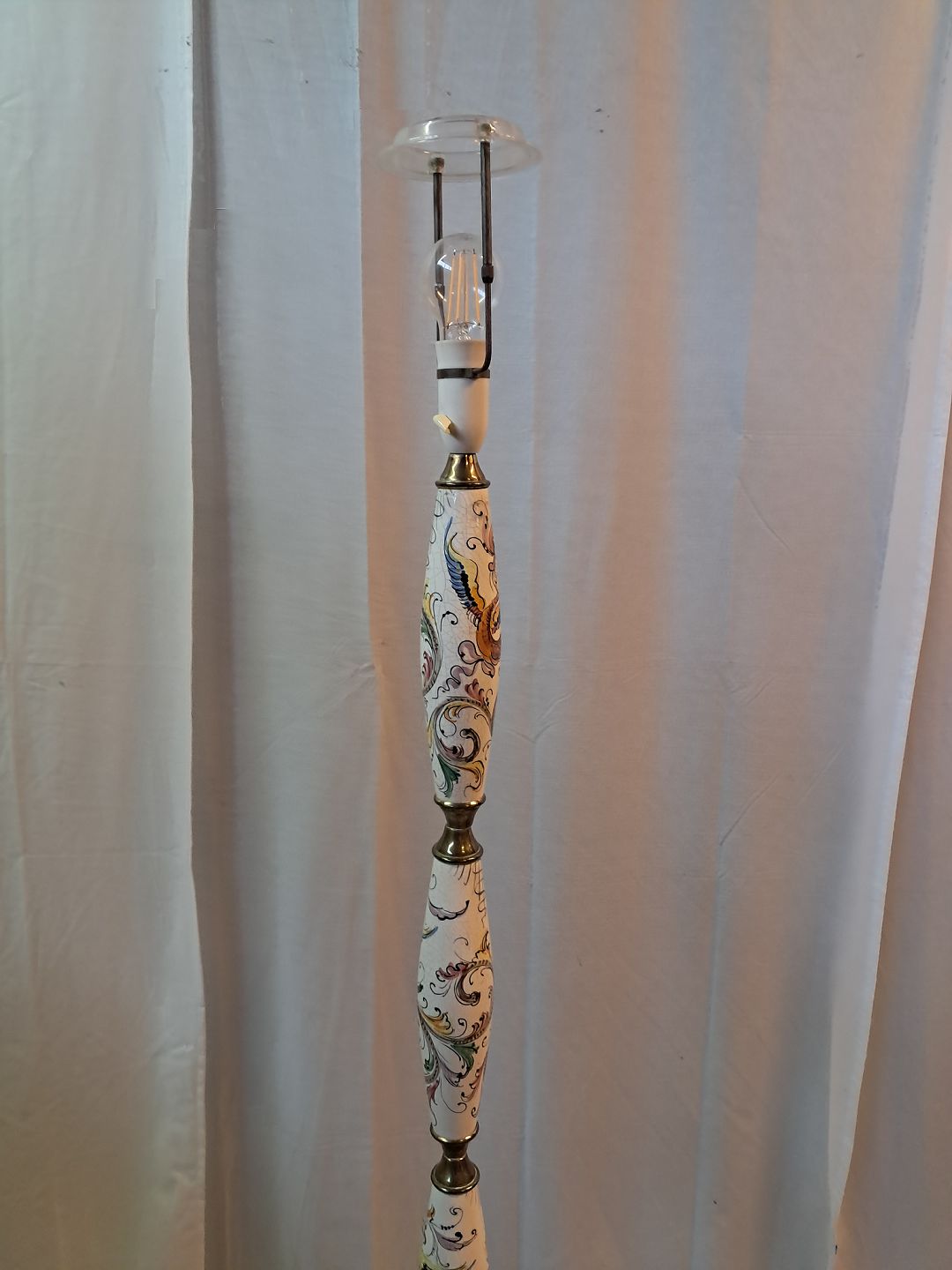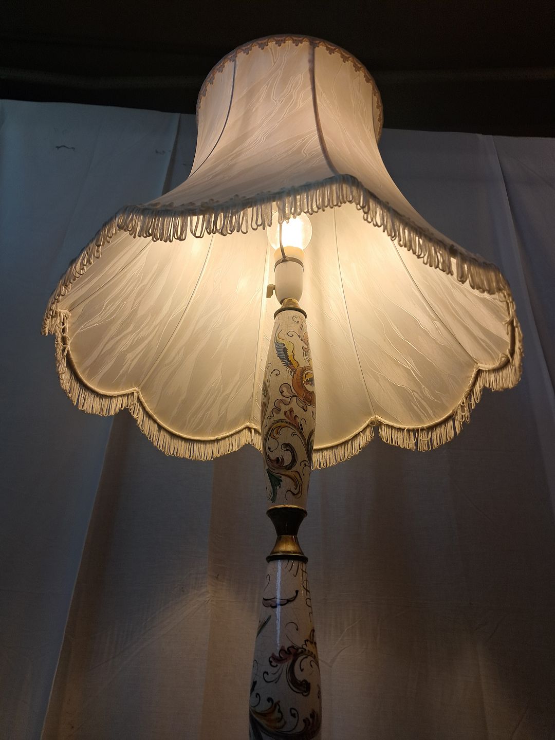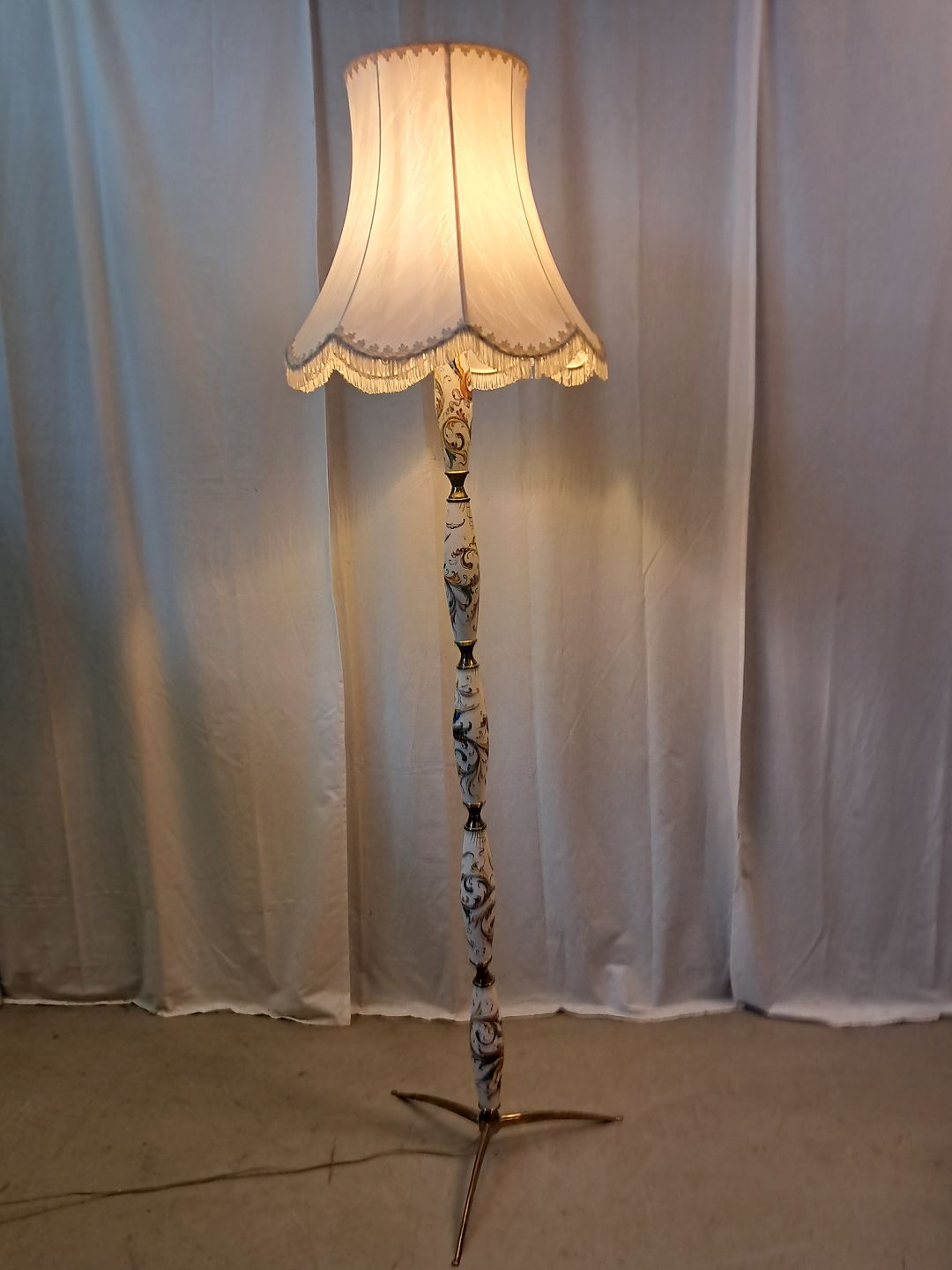 Gulvlampe i metal og pocelæn med skærm, fra 1980erne.Den har brugsspor.