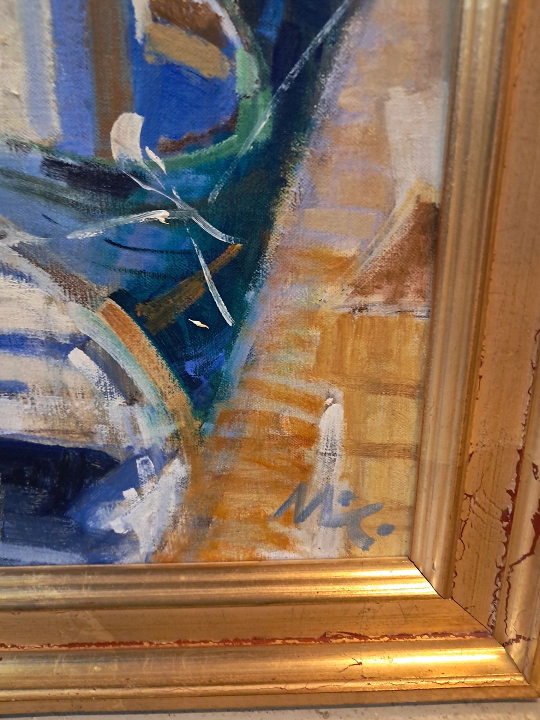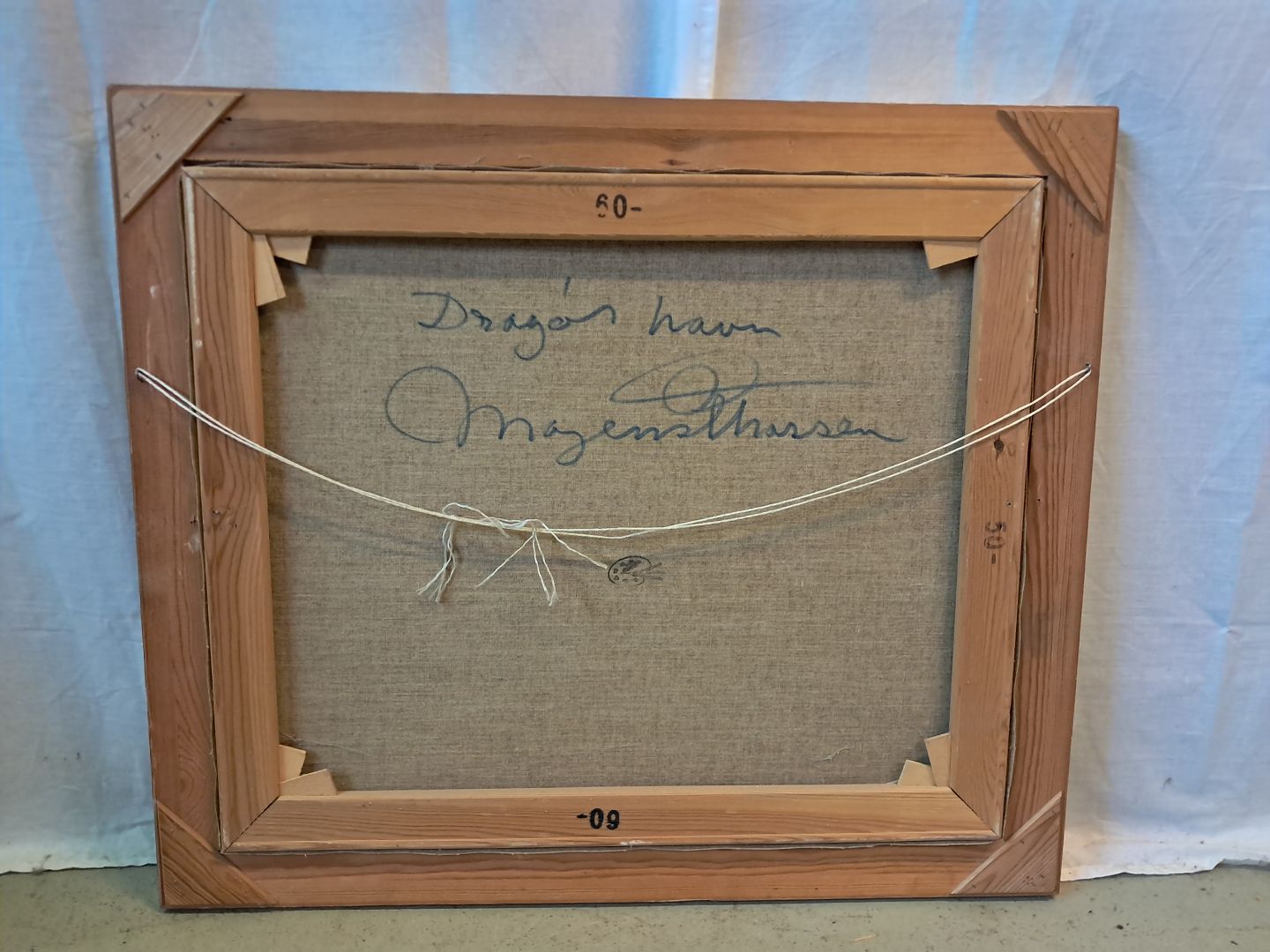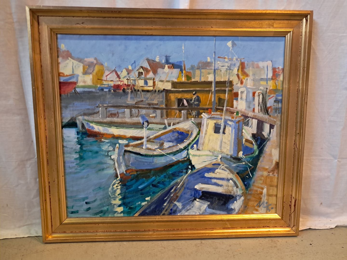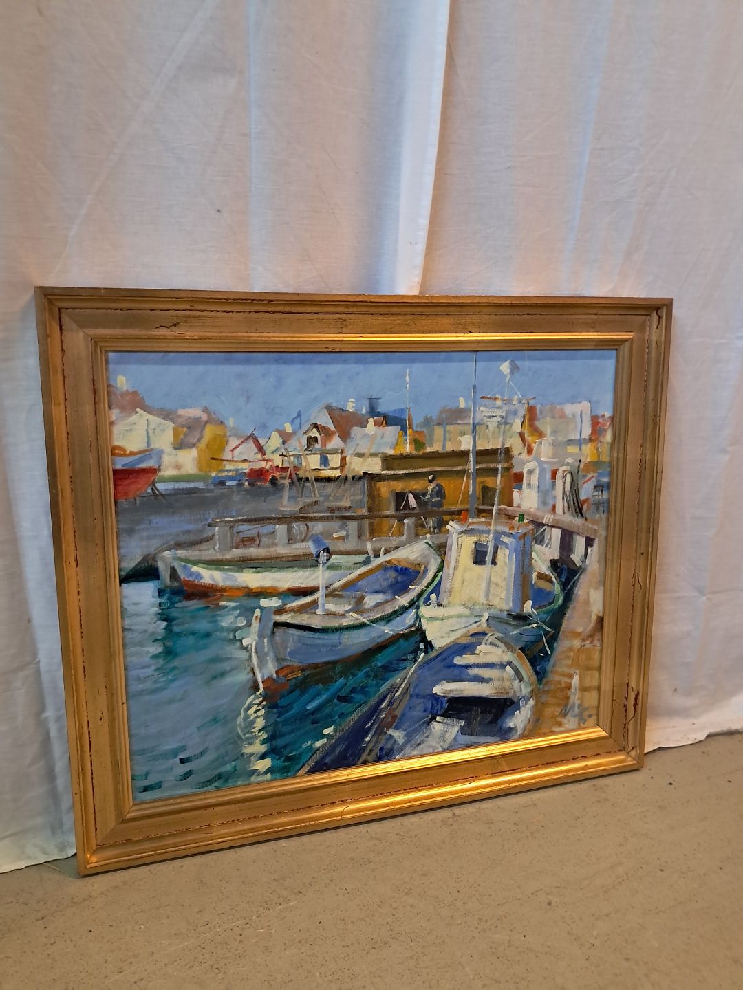 Maleri af Dragør havn i guldmalet ramme, af : Mogens Amdi Thorsen (1924-2016)Det har brugsspor.