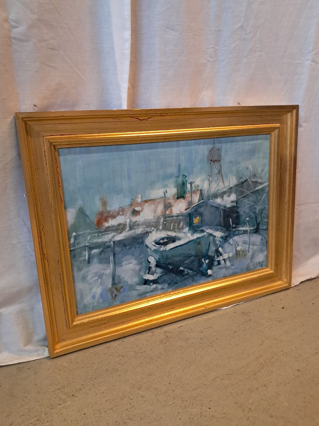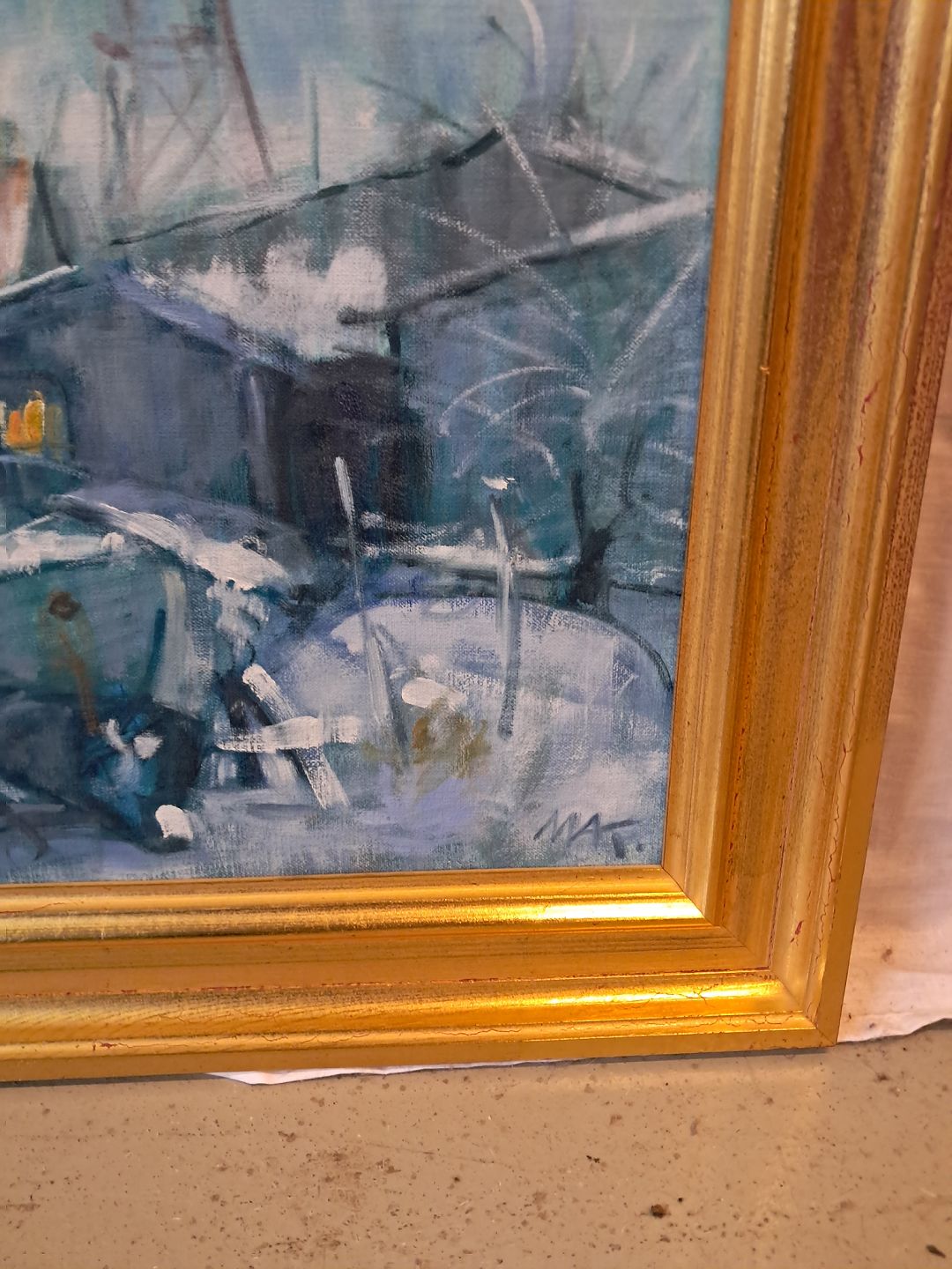 Maleri af Dragør Havn i guldmalet ramme, af : Mogens Amdi Thorsen (1924-2016)Det har brugsspor.