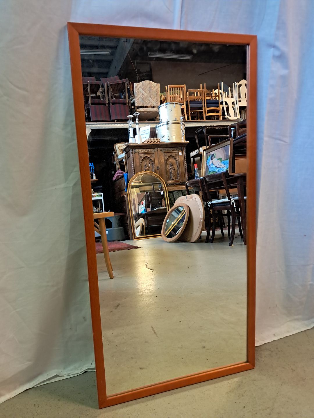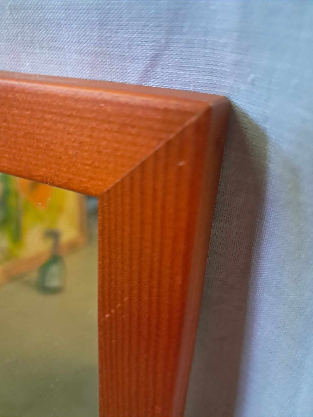 Spejl i massivt og bejdset fyrretræ, fra 1980erne.Det har brugsspor.