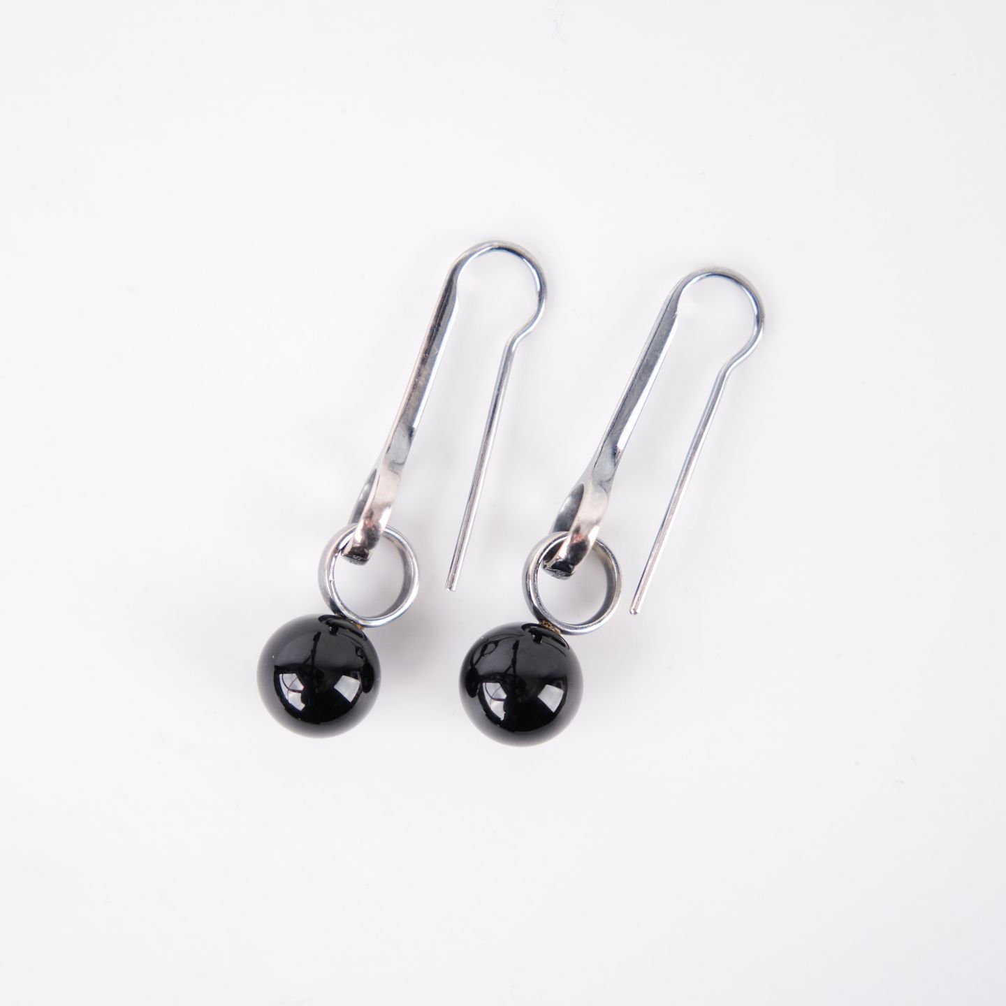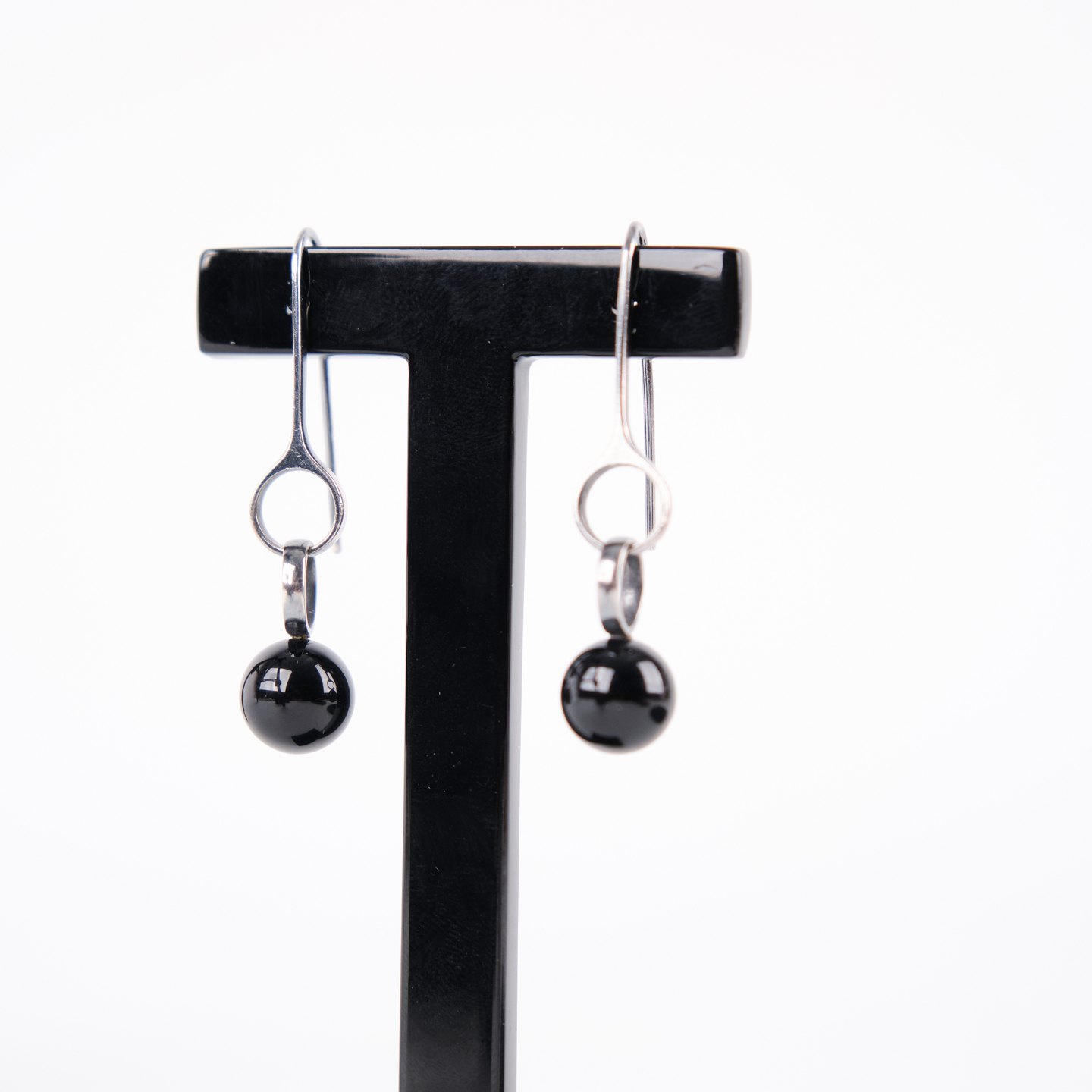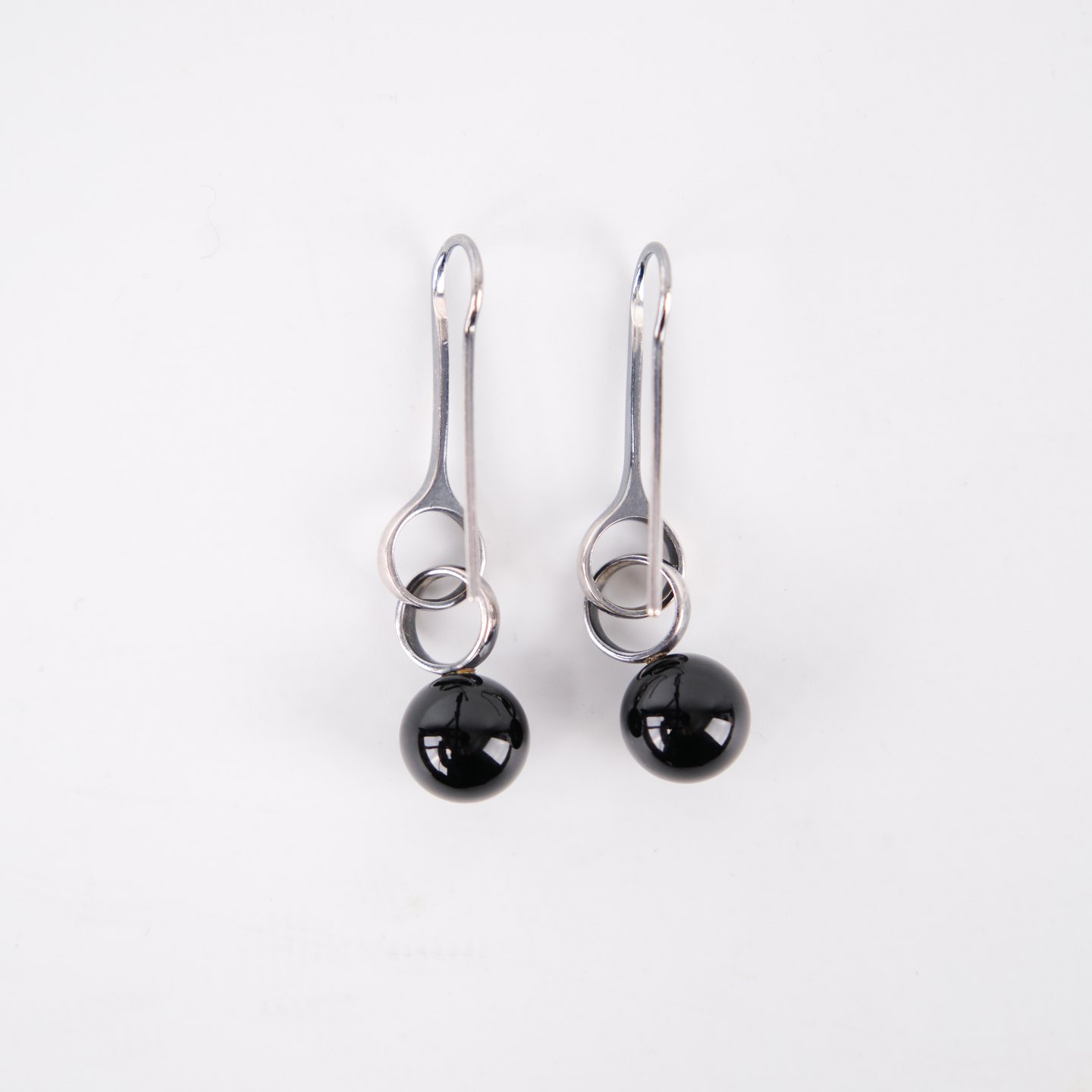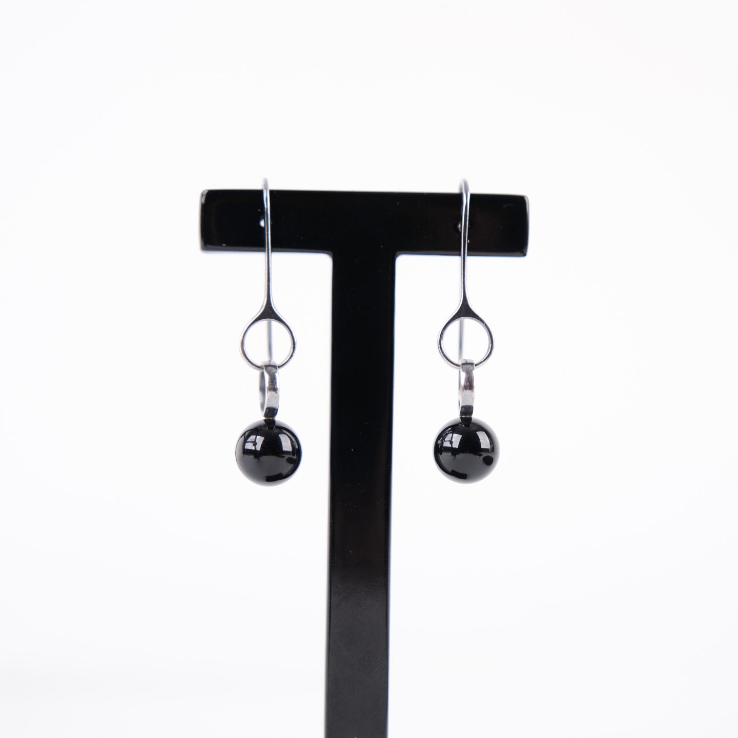 Ohrhänger aus Sterling Silber, gestempelt GJ 925S, entworfen von Regitze Overgaard für Georg Jensen. Elegante Kugel-Ohrringe mit schwarzem Achat, Modell 473A. Klassisches Schmuckdesign mit klaren Linien und hochwertigen Materialien.— Designerin: Regitze Overgaard