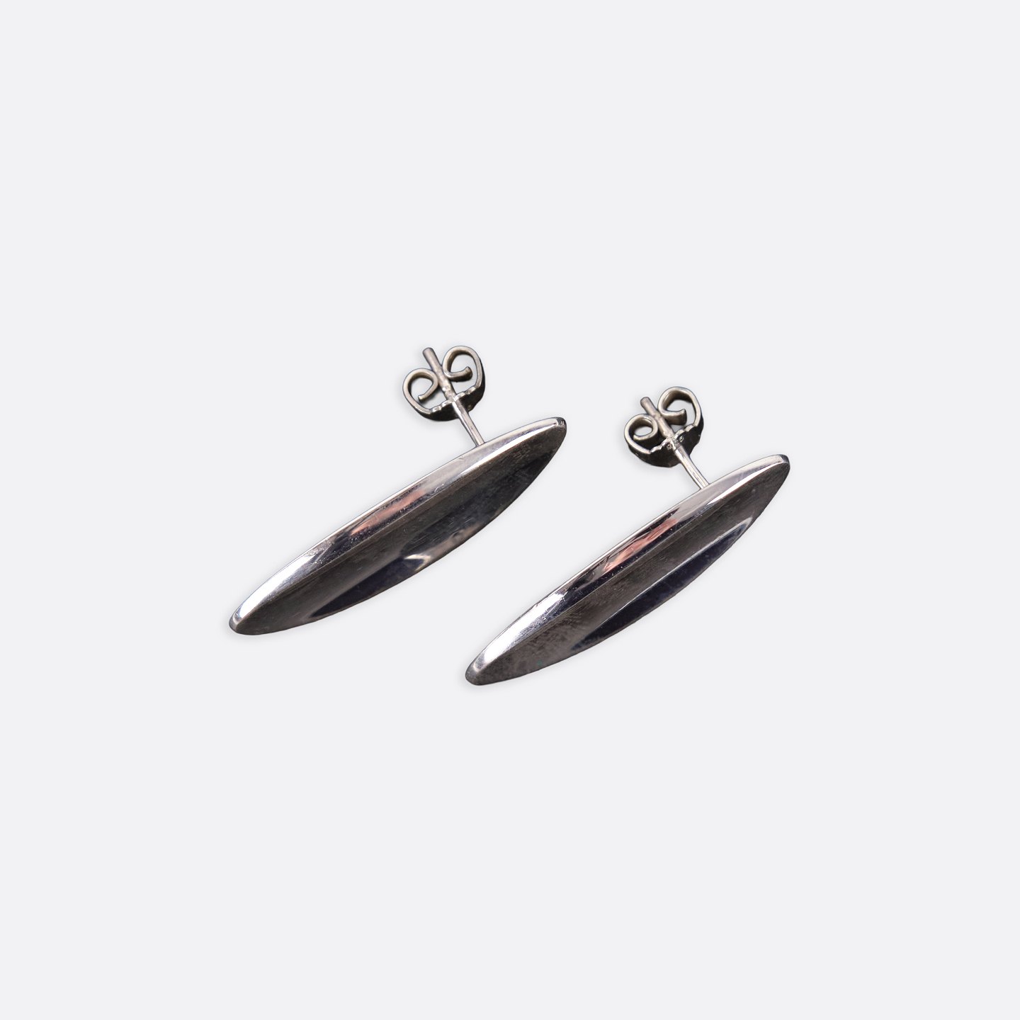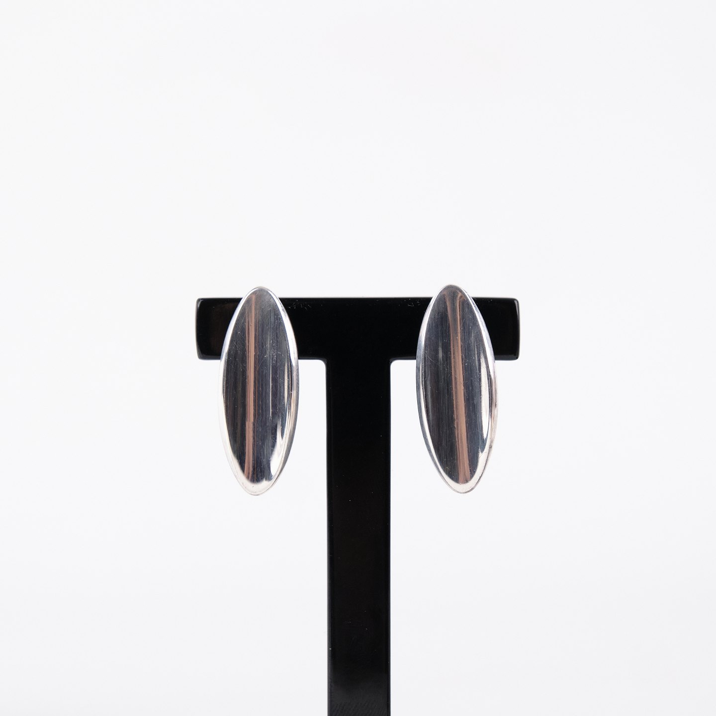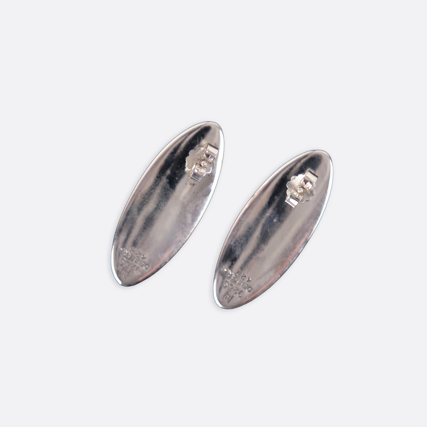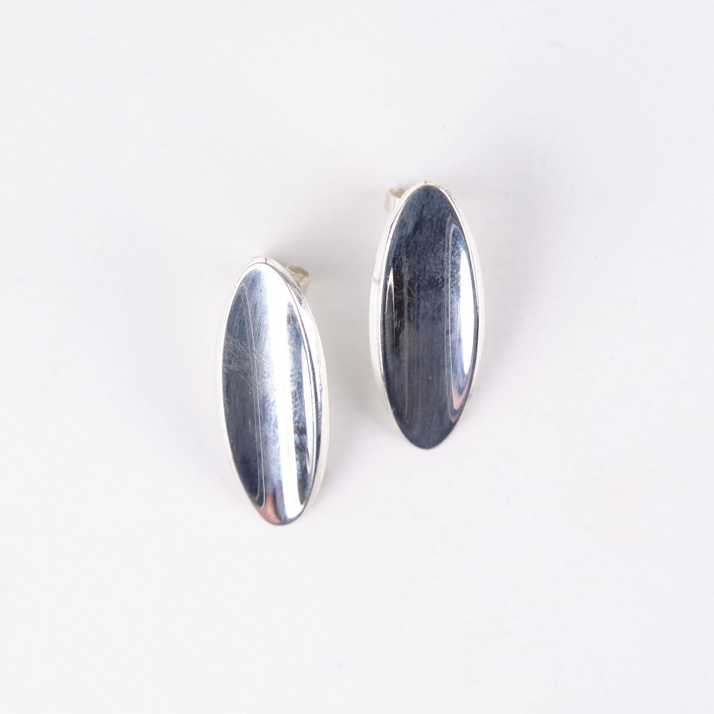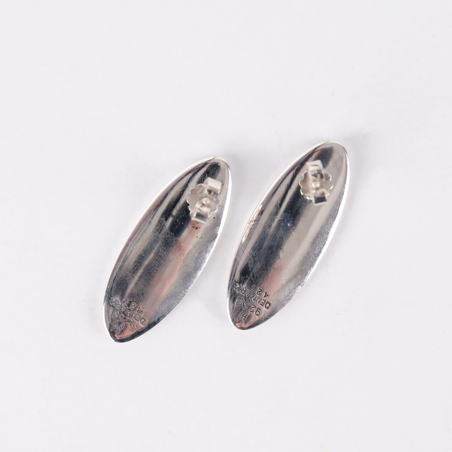 Oval stud earrings in sterling silver, model no. 427, designed by Hans Hansen. Elegant and timeless Danish jewelry design with the clean organic shape characteristic of the maker. A classic pair of solid silver earrings.— Designer/Manufacturer: Hans Hansen