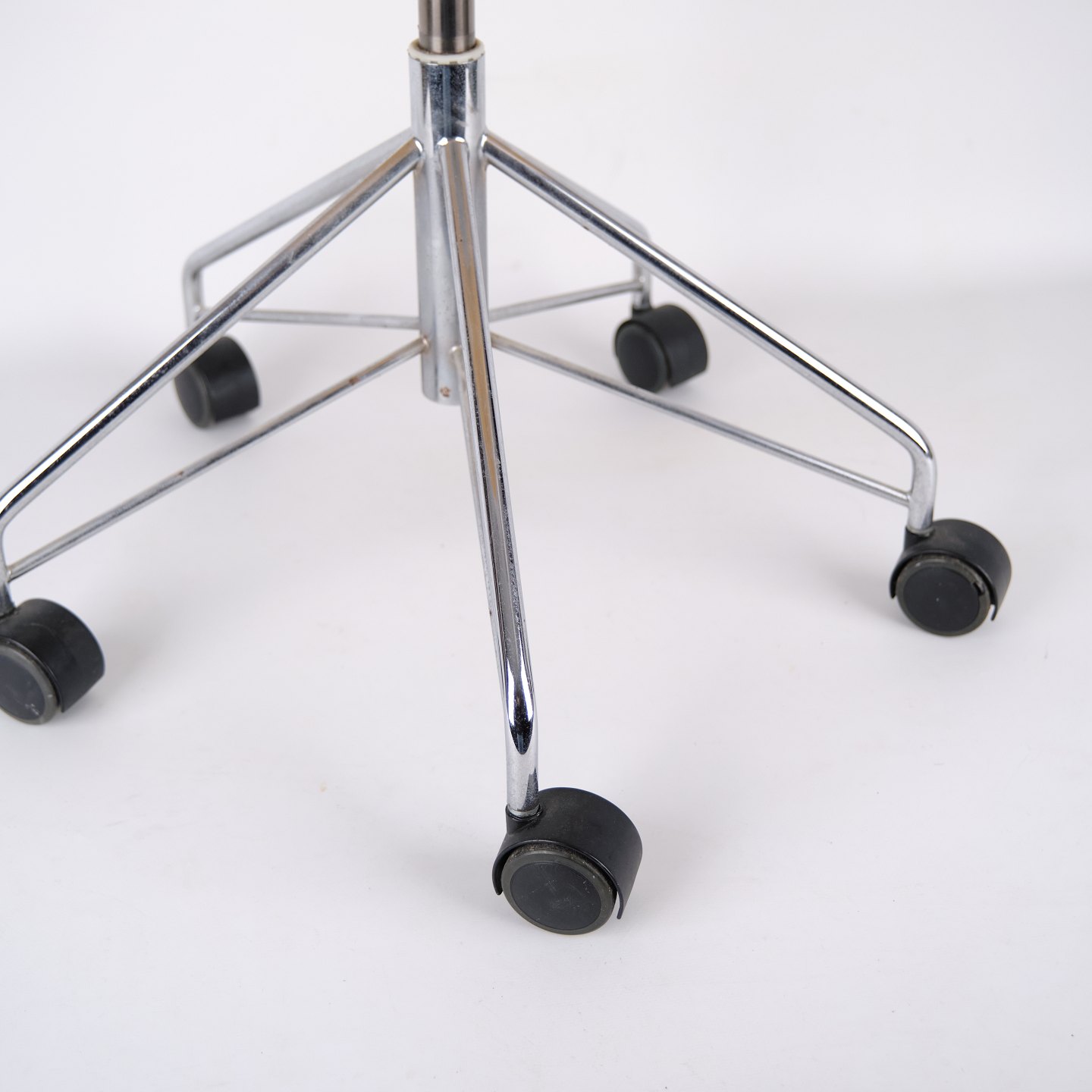 Arne Jacobsen Syver kontorstol, model 3117, for Fritz Hansen. Patineret naturlæder og kromstel med hjul. Klassisk dansk design.— Oprindelse: Danmark