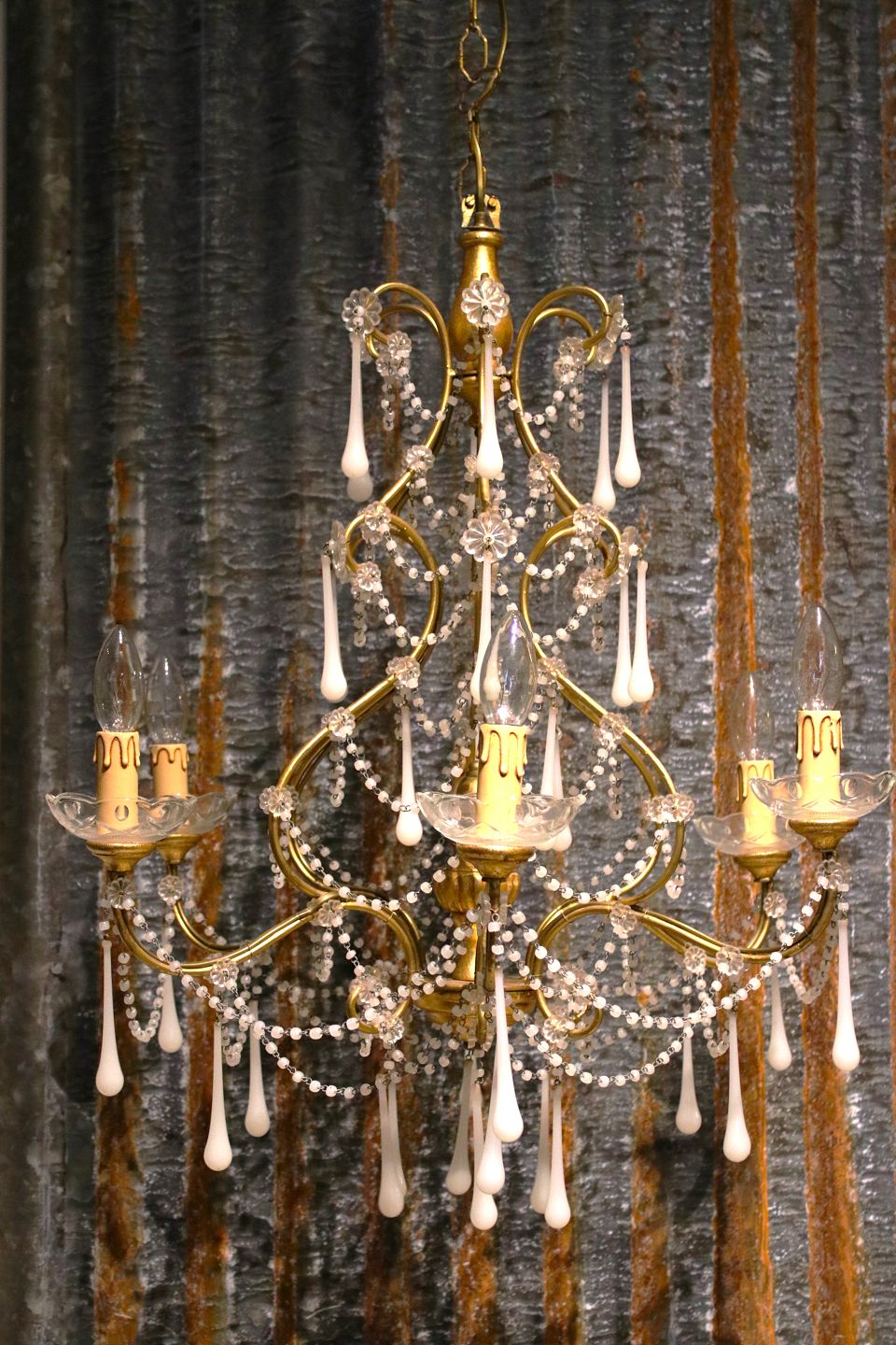 Fransk lysekrone i forgyldt metal og træ , dekoreret med hvide glas dråber og kæder. Lysekronen har 6 lyskilder.H: 75cm. Dia.: 60cm.