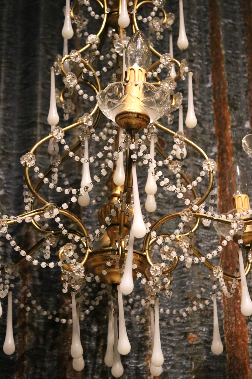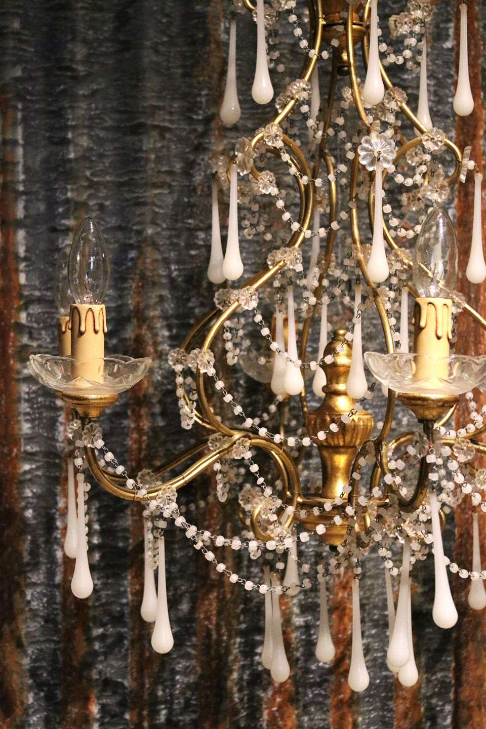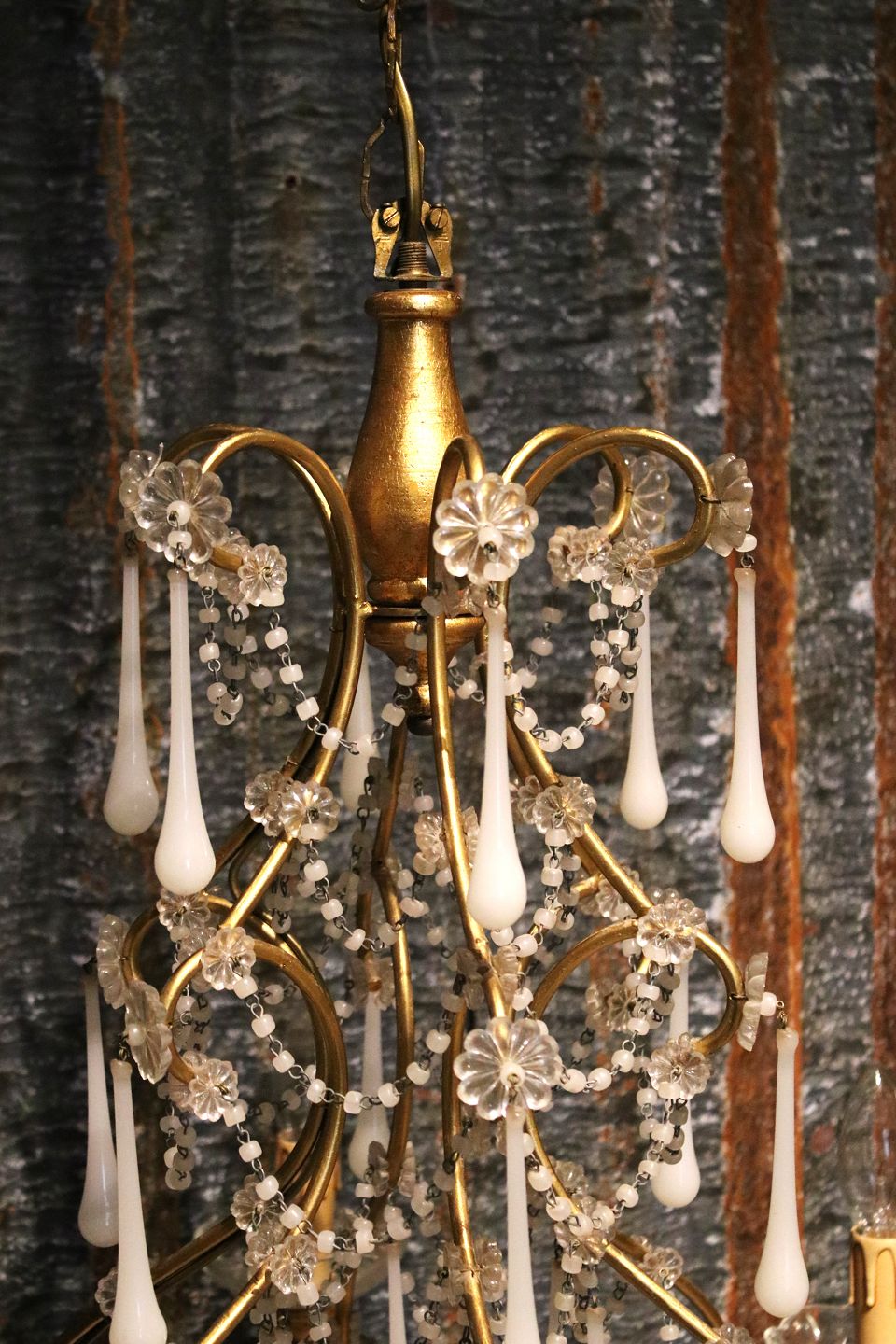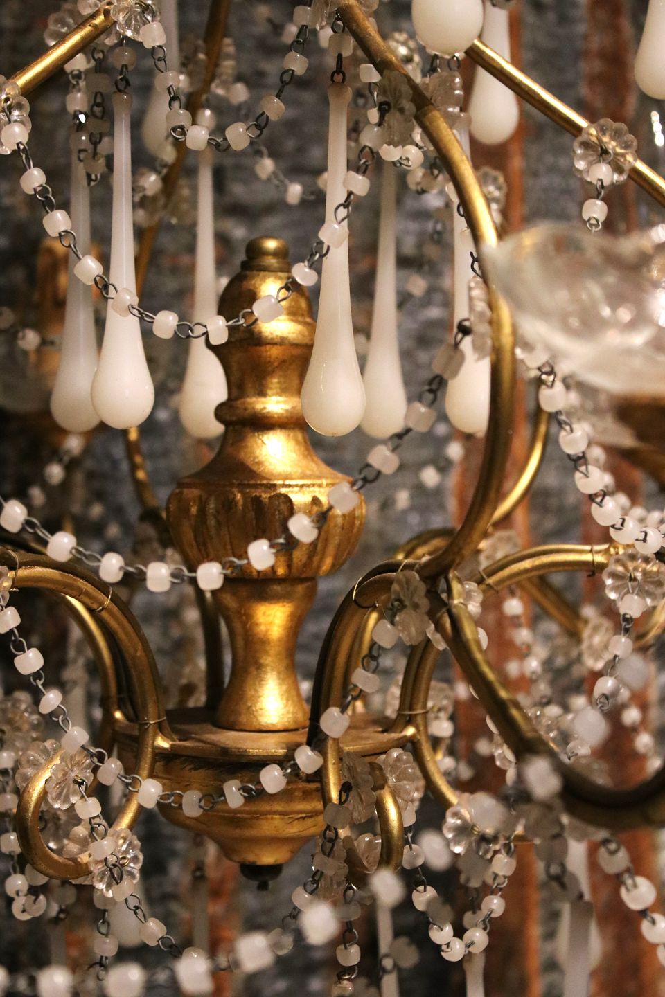 Fransk lysekrone i forgyldt metal og træ , dekoreret med hvide glas dråber og kæder...