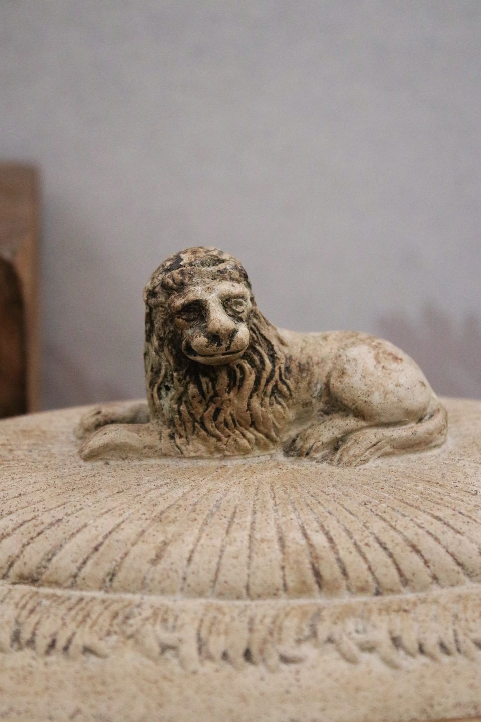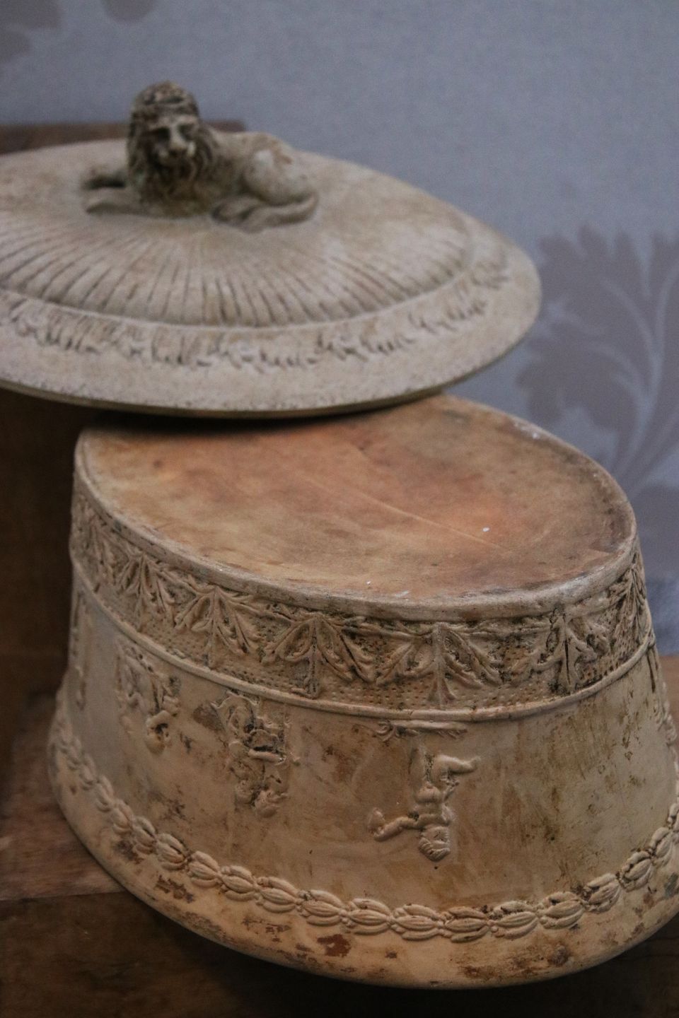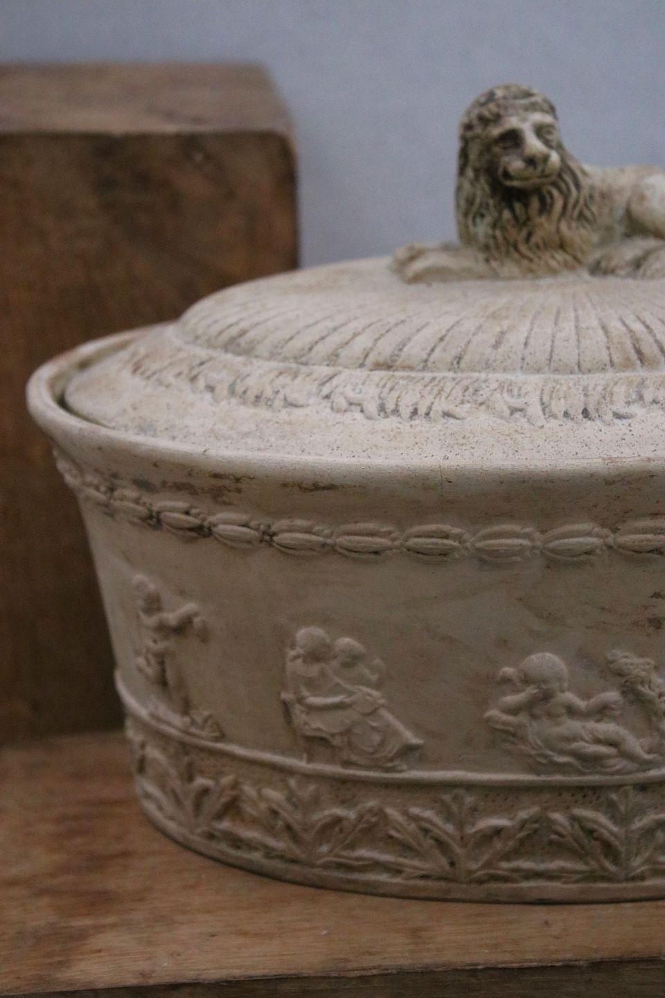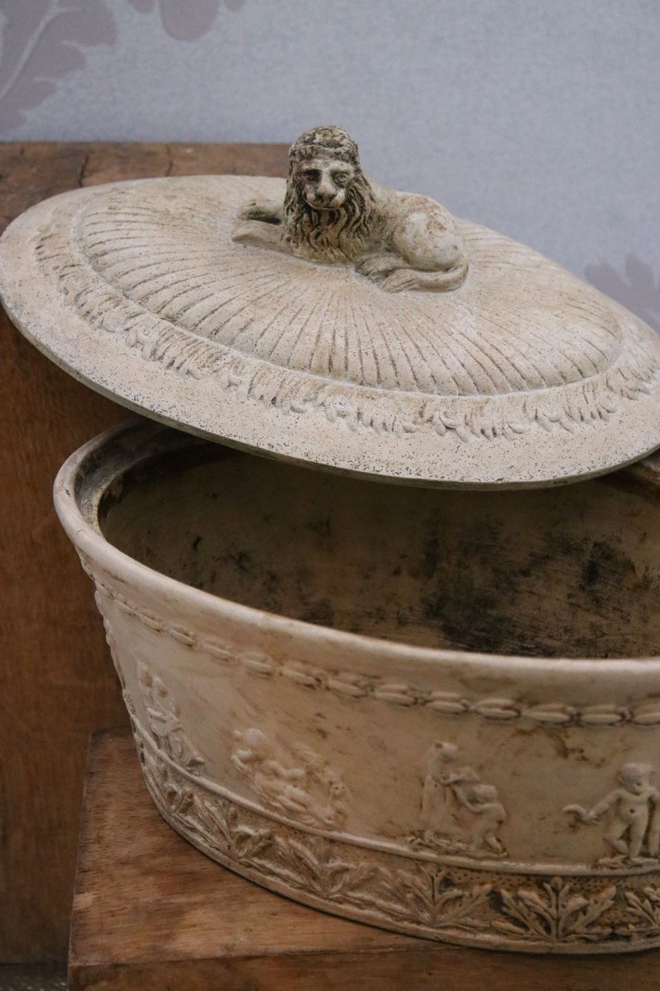Antik svensk oval empire fajance terrin fra 1810-40 med fine dekorationer og løve liggende på låget...