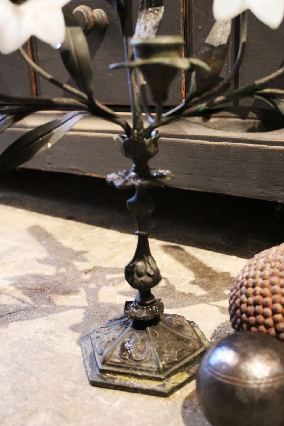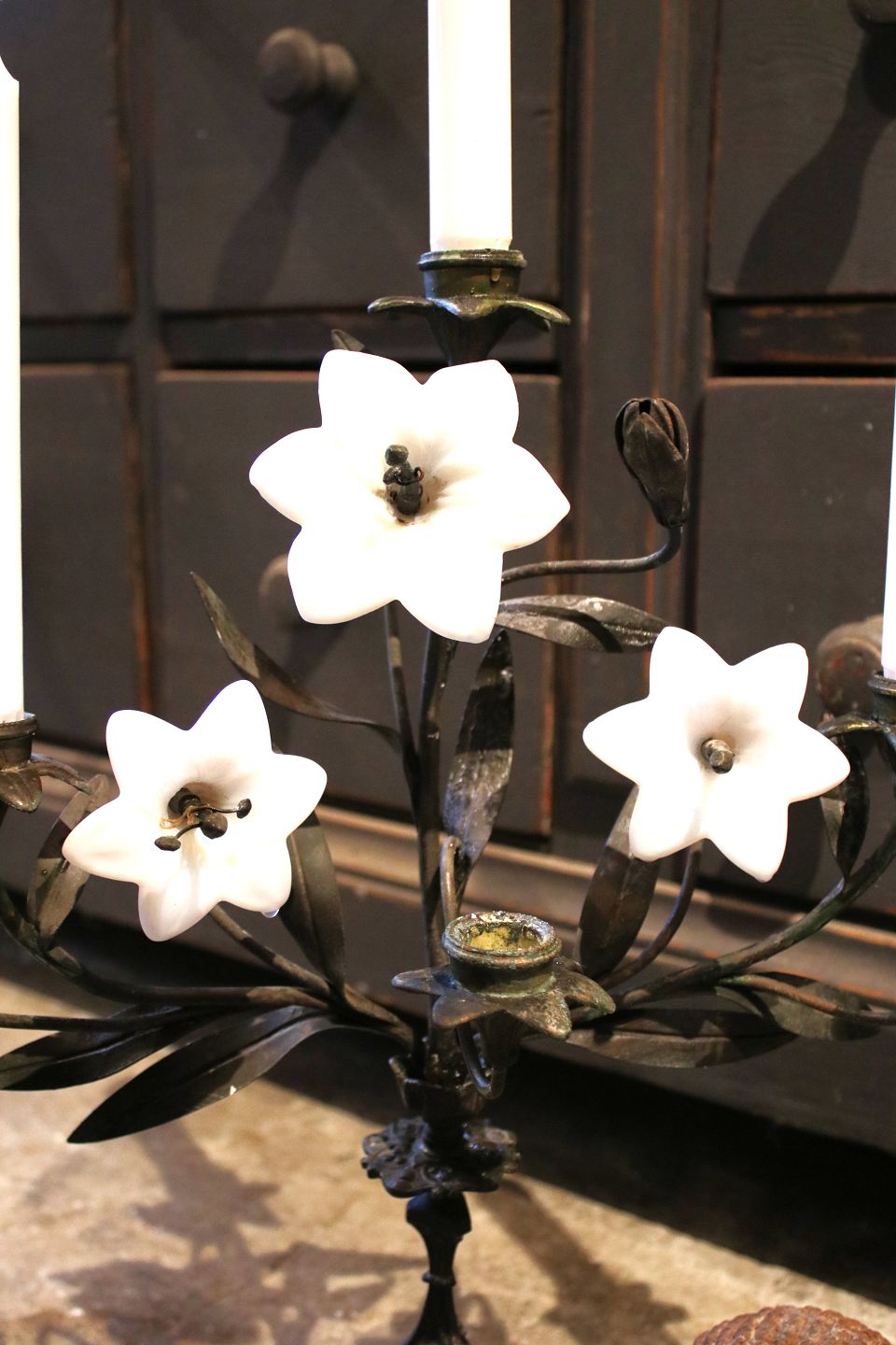 Antik , fransk lysestage i mørk patineret bronze , dekoreret med 3 gamle hvide glas blomster...