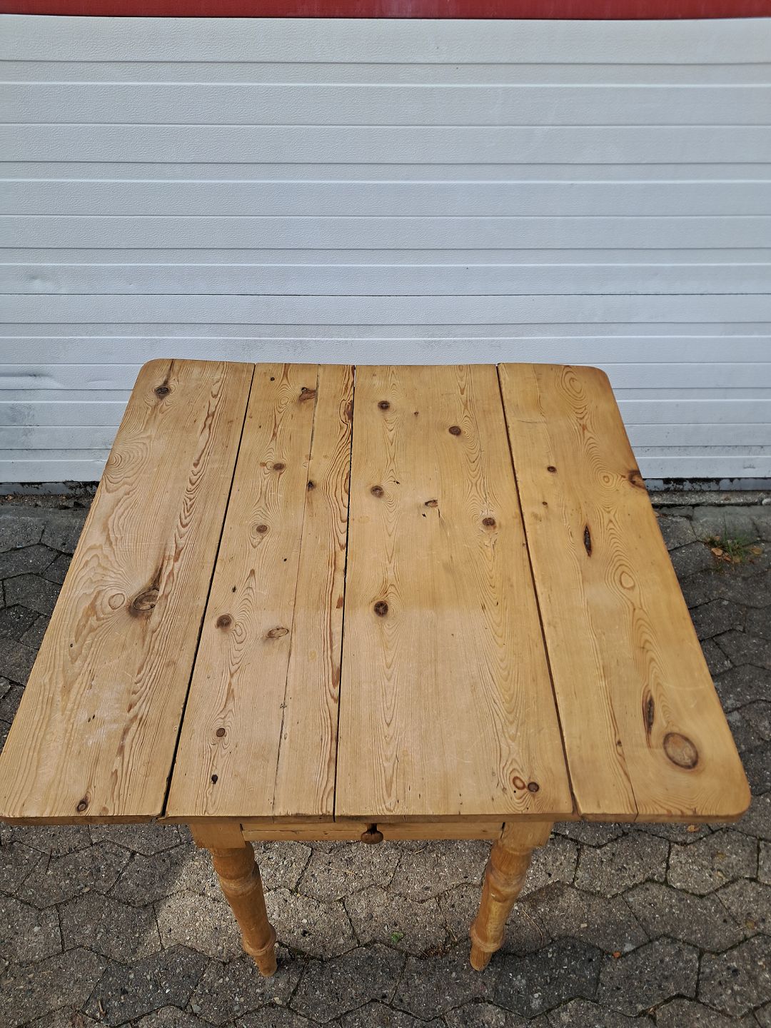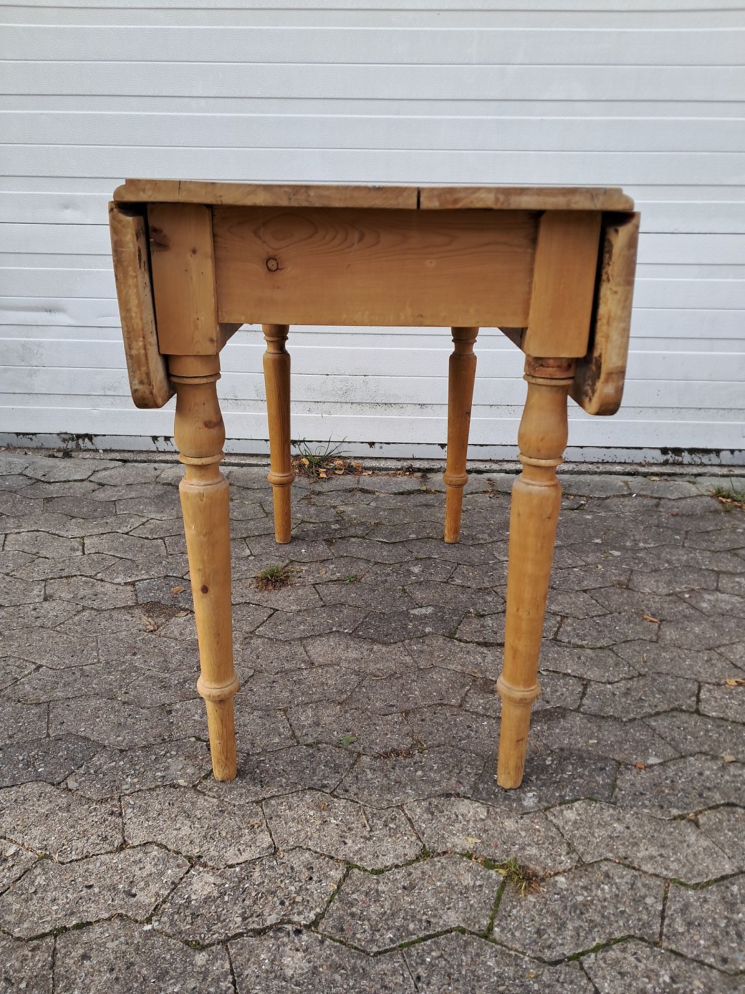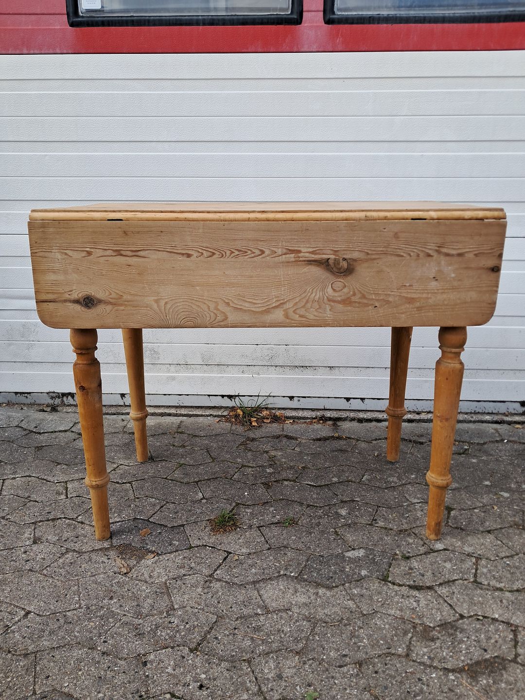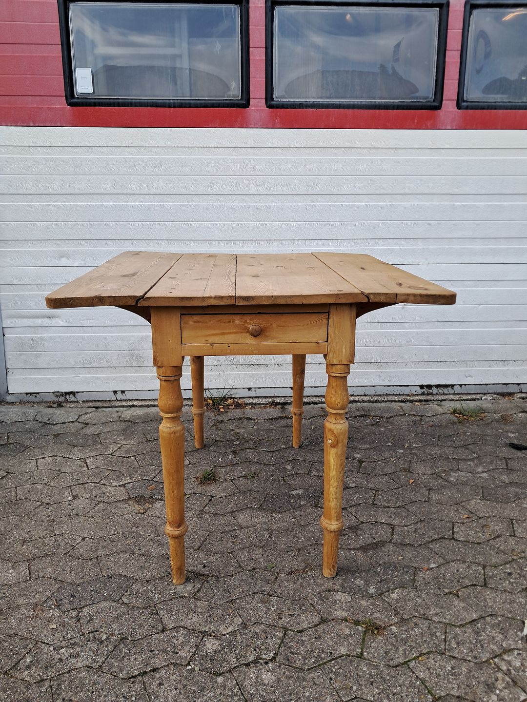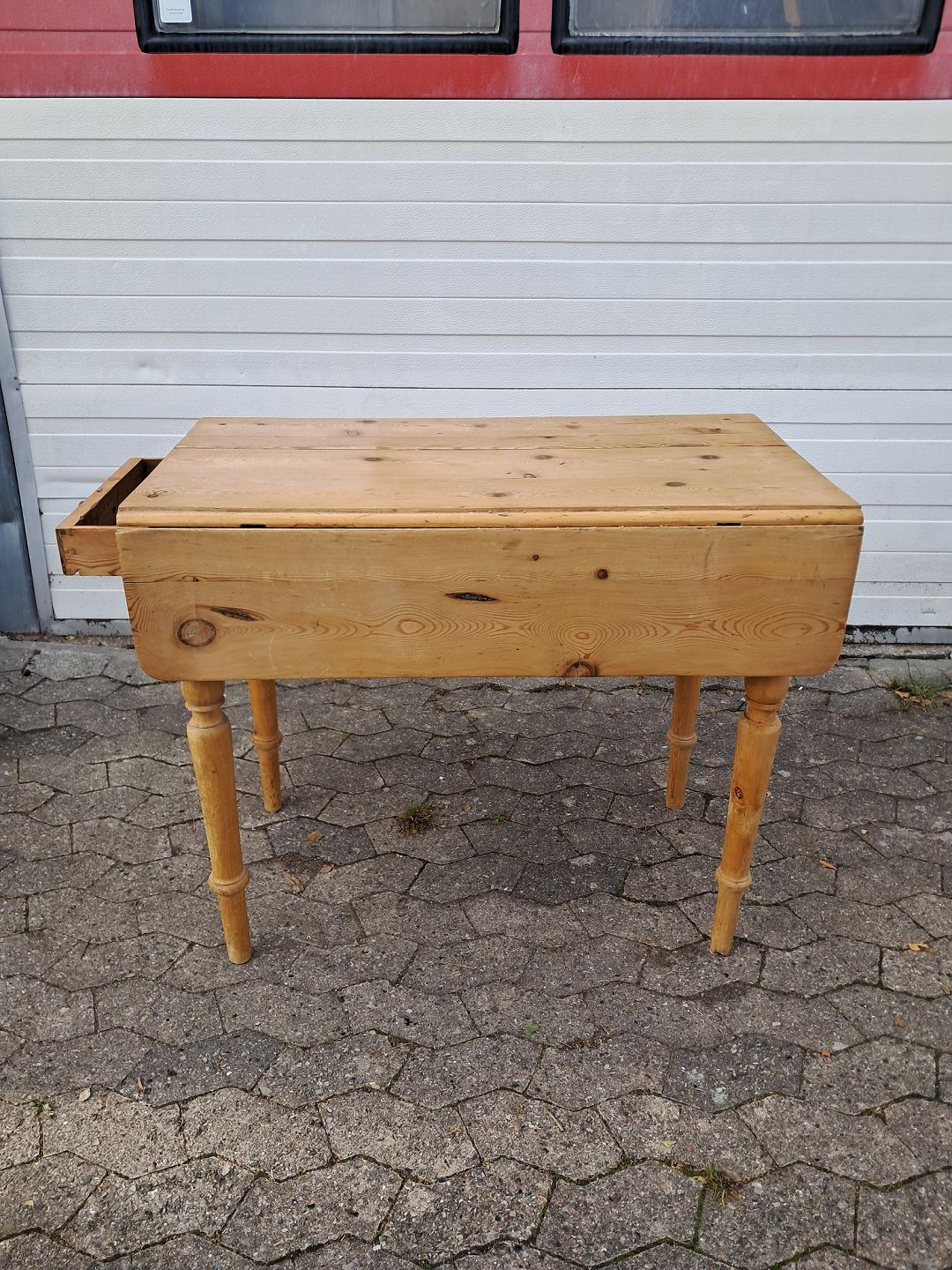 Bord i massivt fyrretræ med klapper og skuffe, fra 1920erne.Det har brugsspor.
