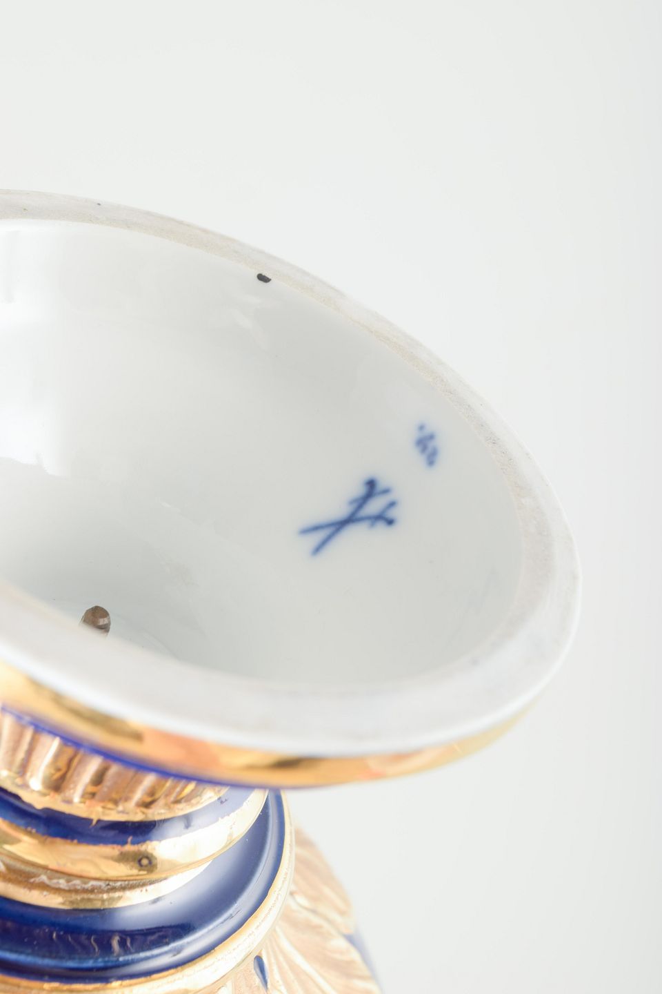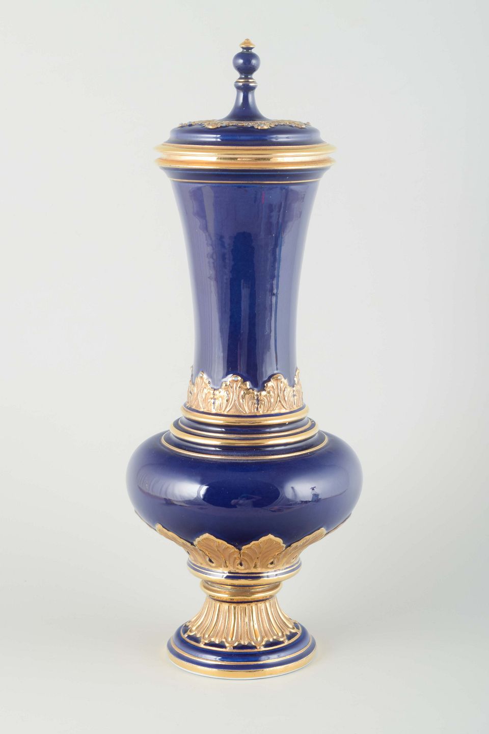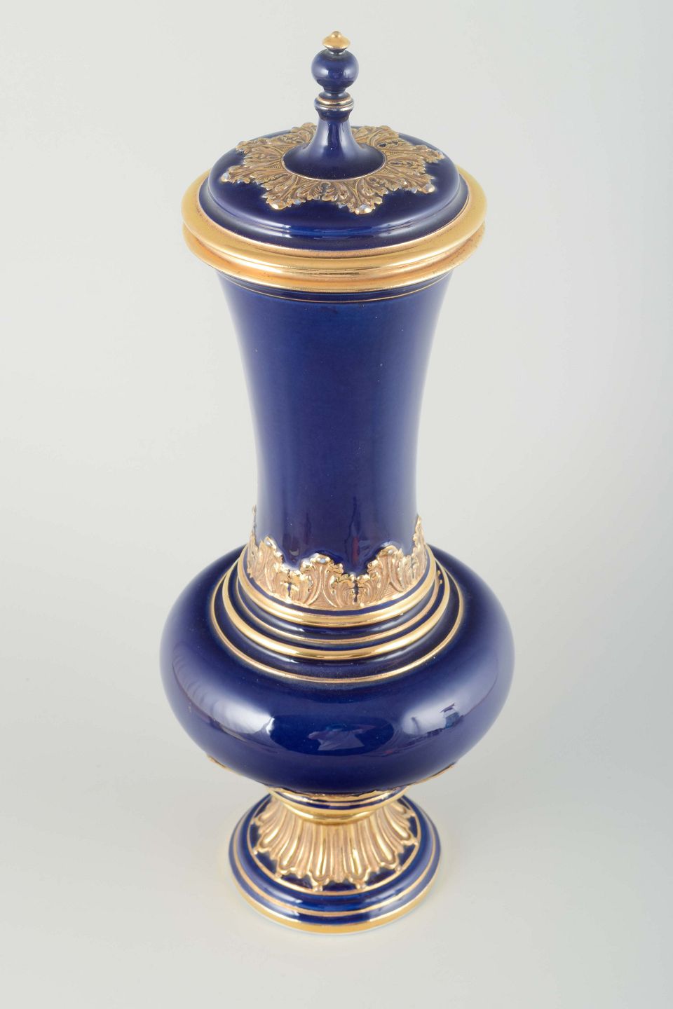 Elegant lidded vase in deep cobalt blue glaze, richly decorated with gilded acanthus and band motifs. Classic form with a profiled base and flared neck, executed in Meissen’s characteristic fine quality.