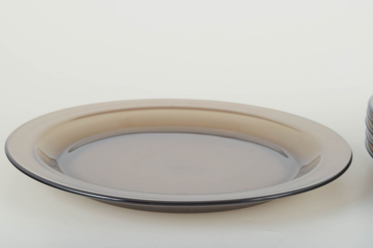 Sæt bestående af seks middagstallerkener i røgfarvet glas. Klassisk fransk design fra Vereco, kendt for sit funktionelle husholdningsglas med enkle linjer og varme toner, karakteristisk for 1970’ernes formsprog.