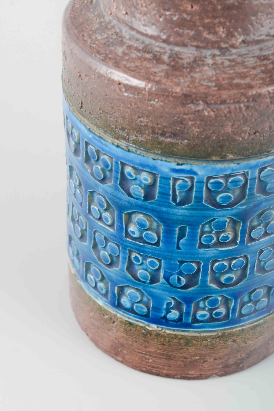 Cylindrisk vase i stentøj med rustik brun glasur og dekorativt bånd i den karakteristiske “Rimini Blu”-glasur med geometrisk reliefmønster i blå, turkis og grønne nuancer.