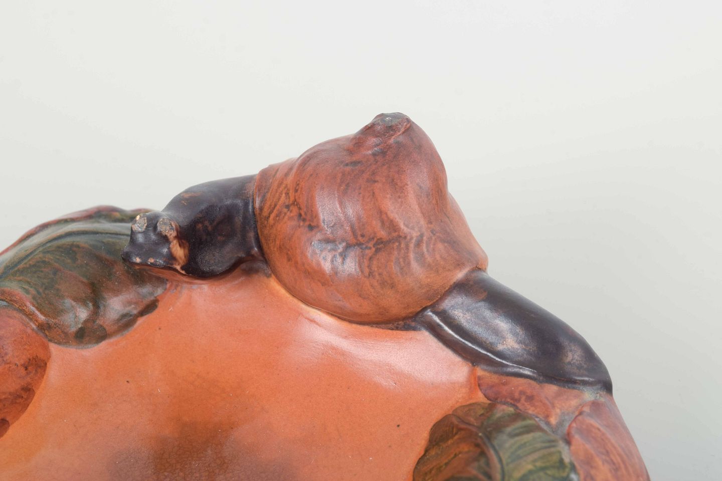Dekorativ skål formet som et blad med en snegl på kanten. Glasur i grønne, brune og orange nuancer med naturlig overfladestruktur. Et klassisk naturinspireret arbejde fra Ipsens Enke, 1920’erne.