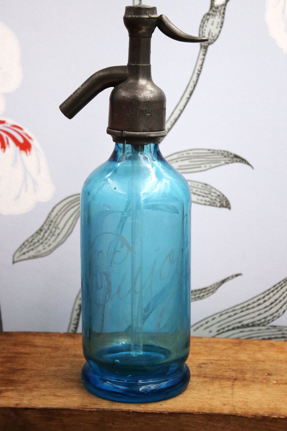 Dekorativ , sjælden fransk mini glas sifon fra begyndelsen af 1900 tallet i turkisblå farve
