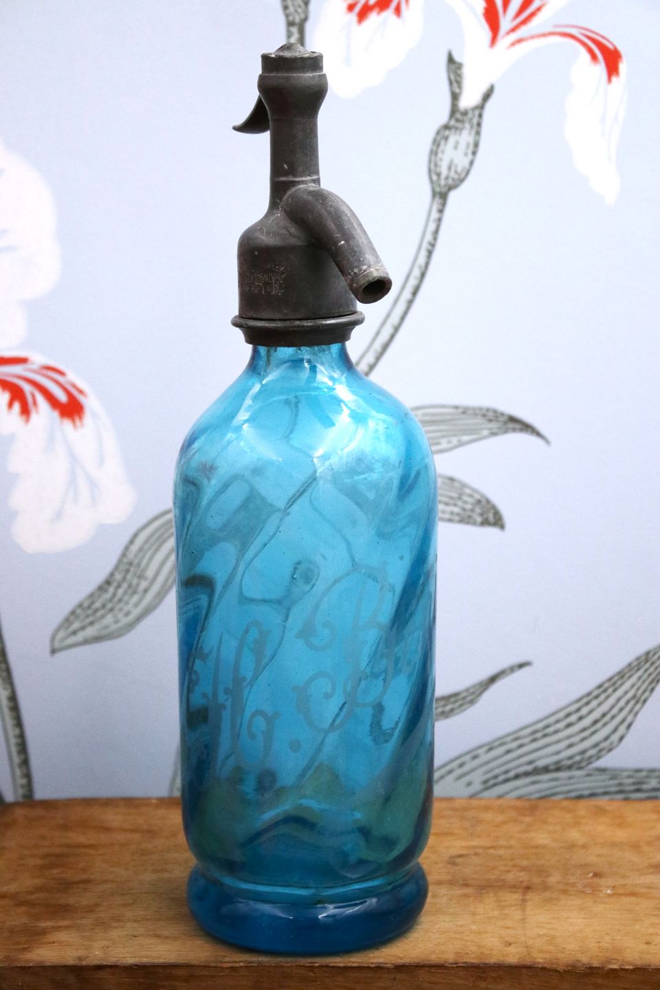 Dekorativ , sjælden fransk mini glas sifon fra begyndelsen af 1900 tallet i turkisblå farve
