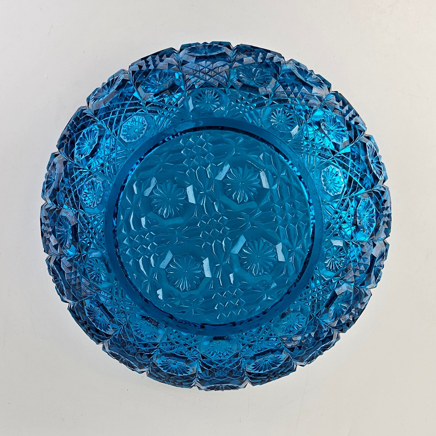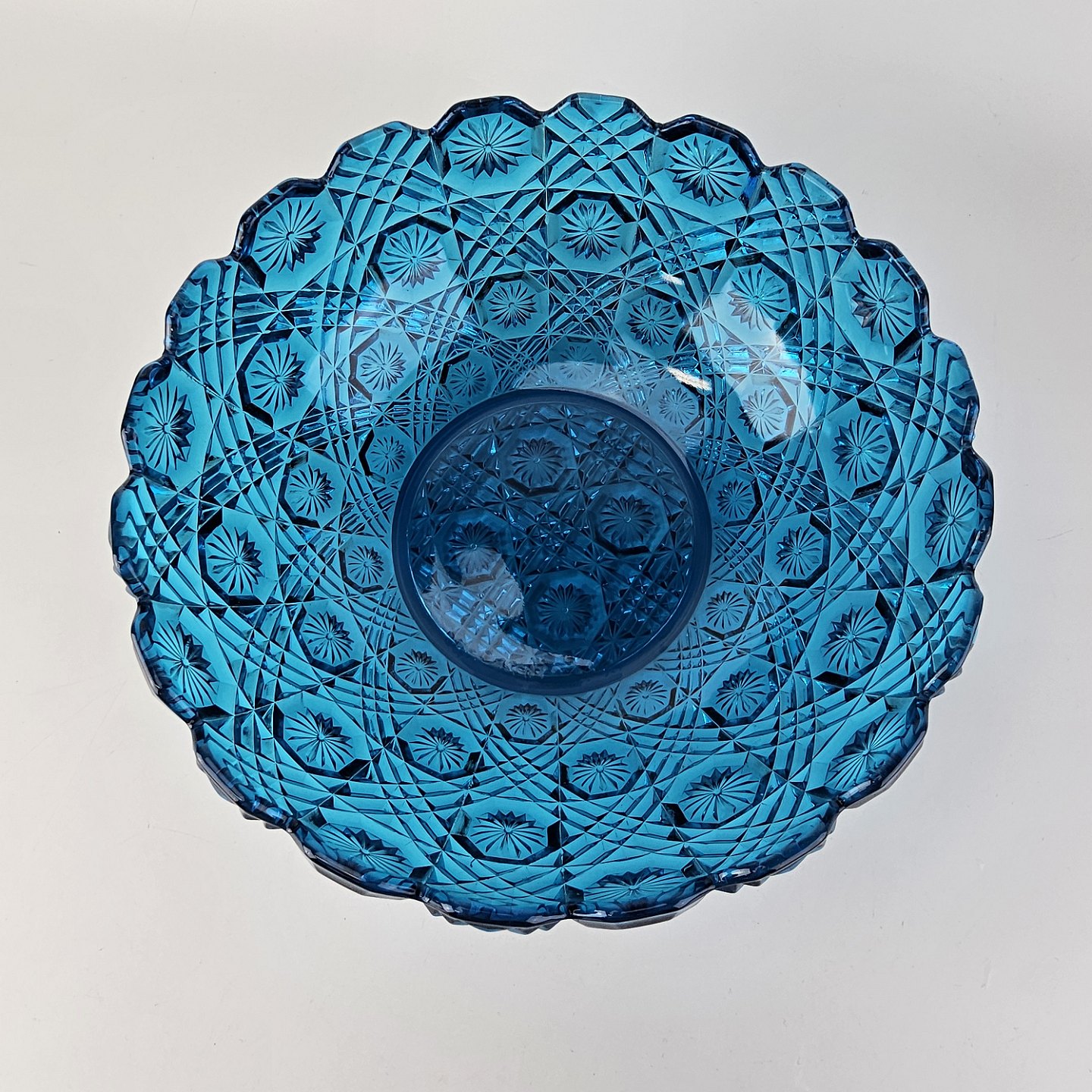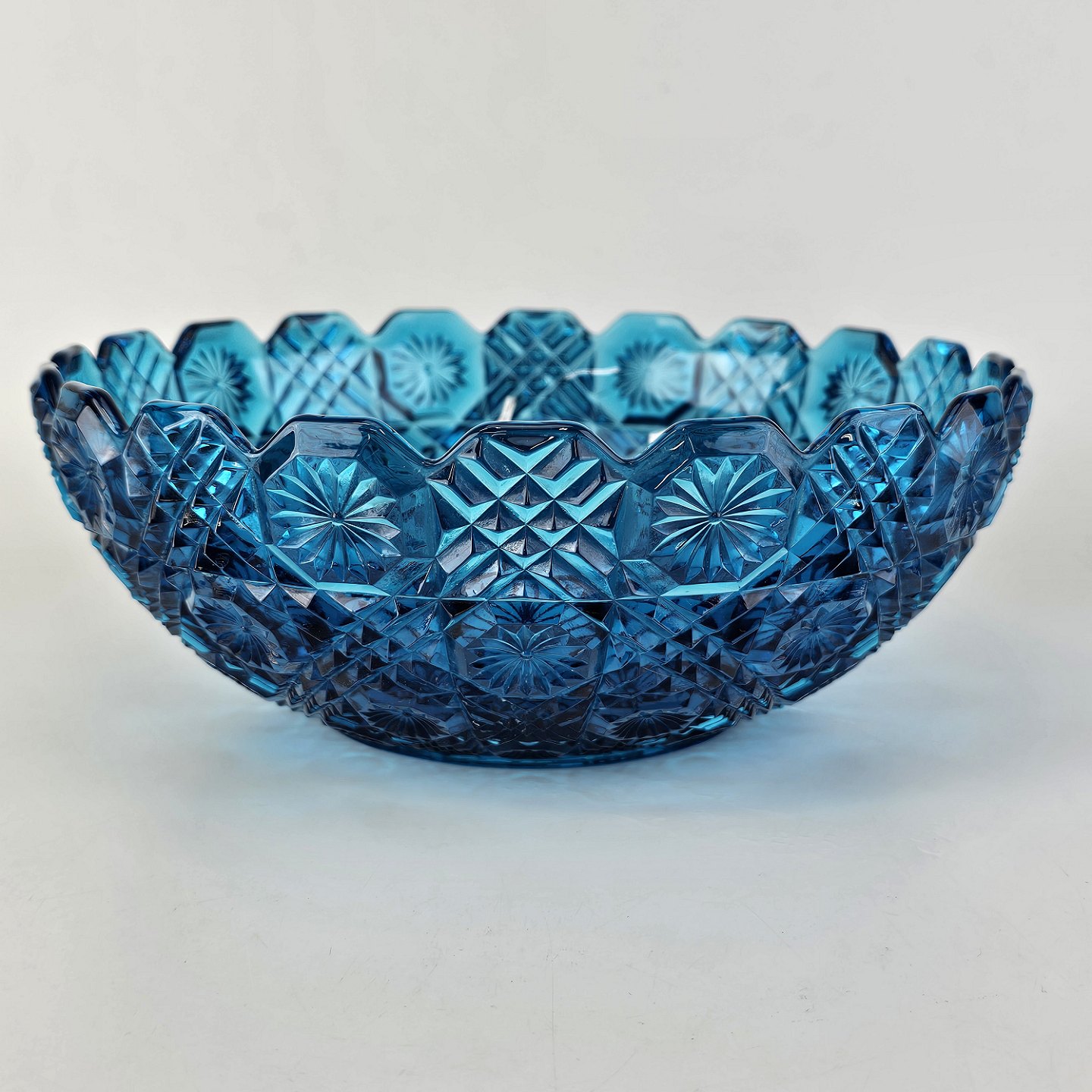 Blå diamantskål i presset glas med efterligning af skærslibningProducent Holmegaard