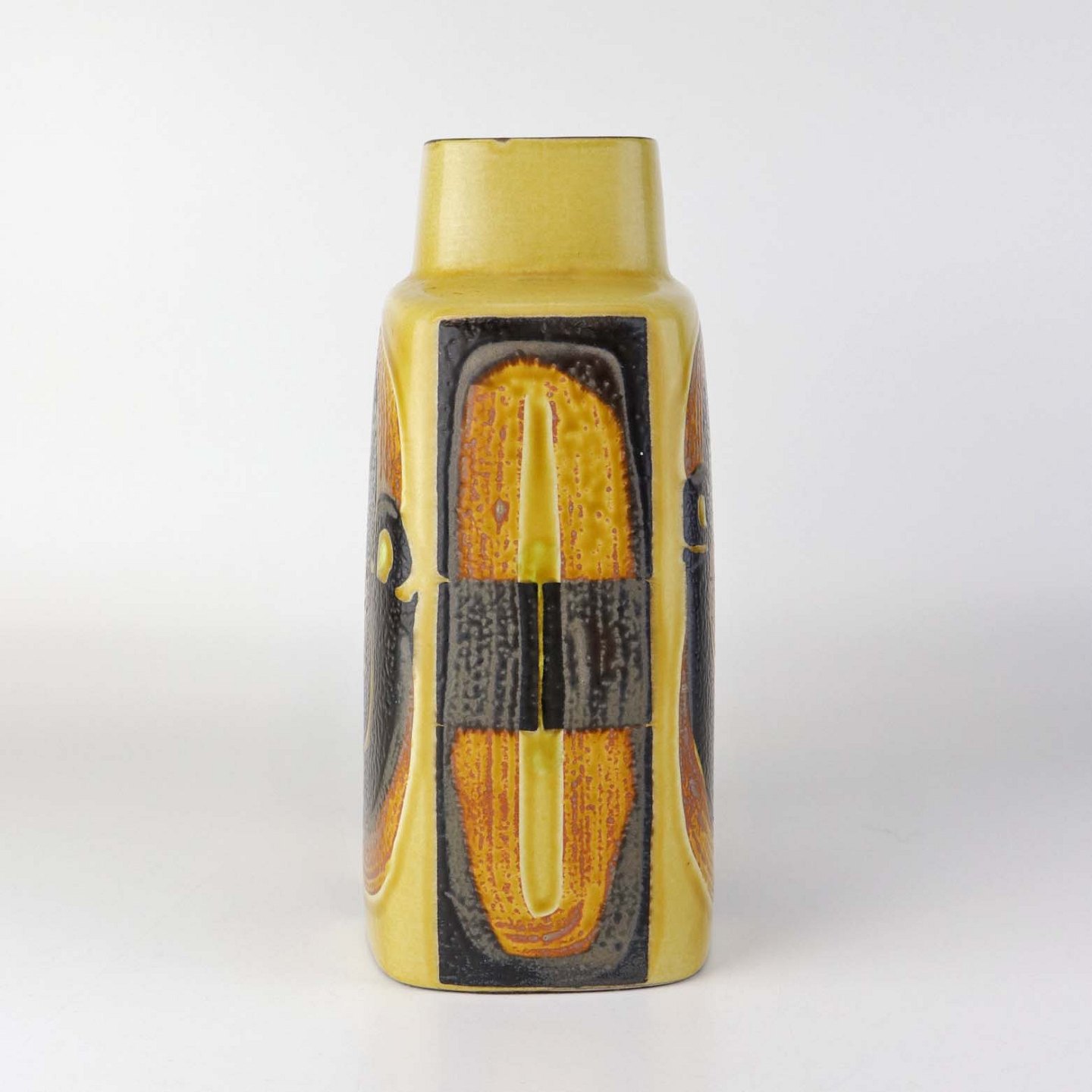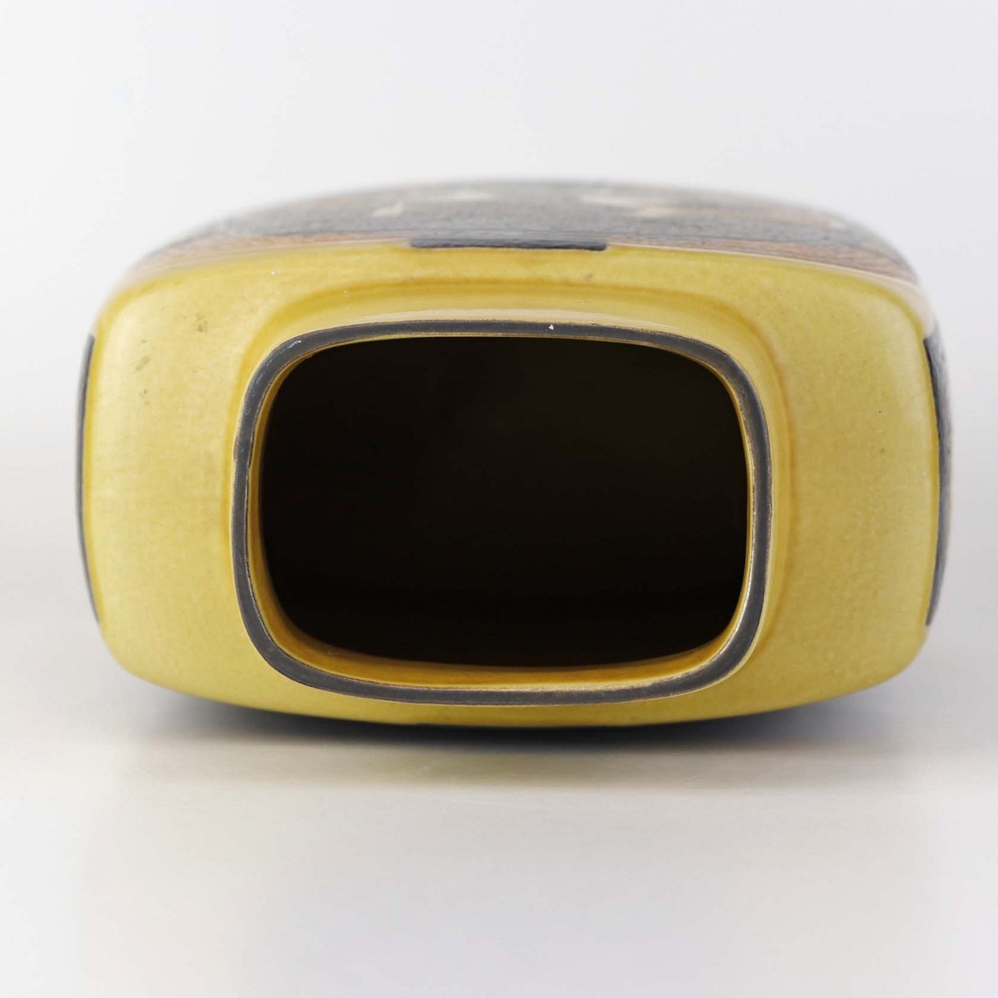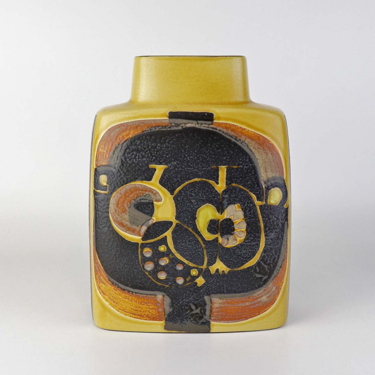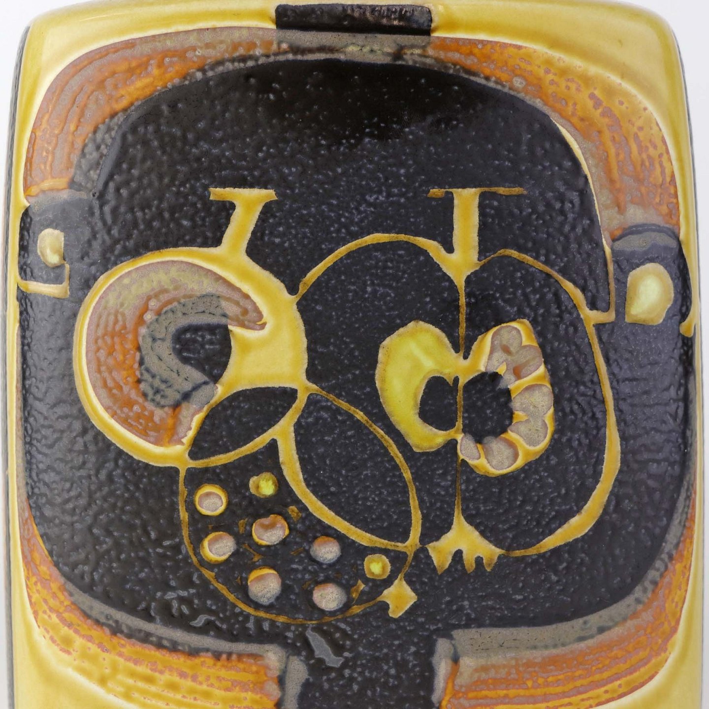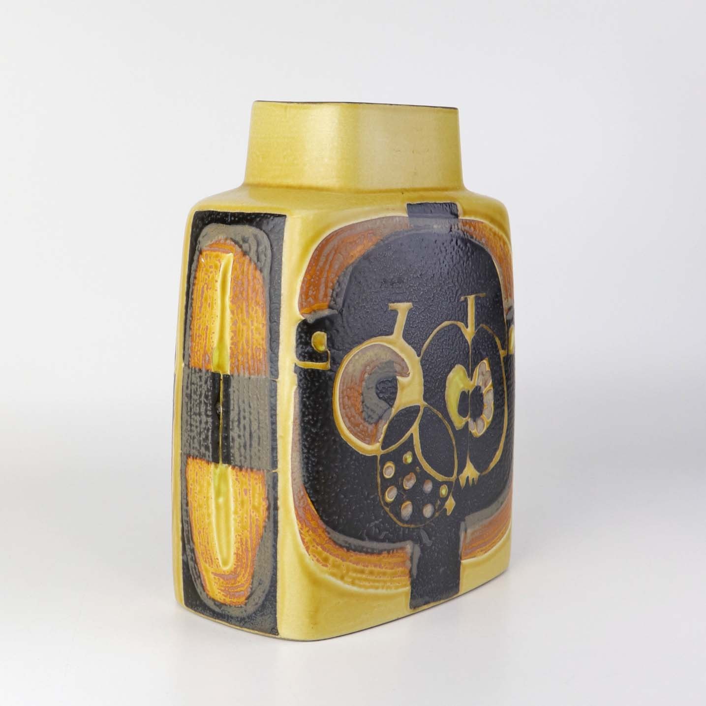 Kantet vase i fajance fra Baca serien i brune og gule farver med motiv af frugter. Nr. 792/3121Formgiver Nils Thorsson