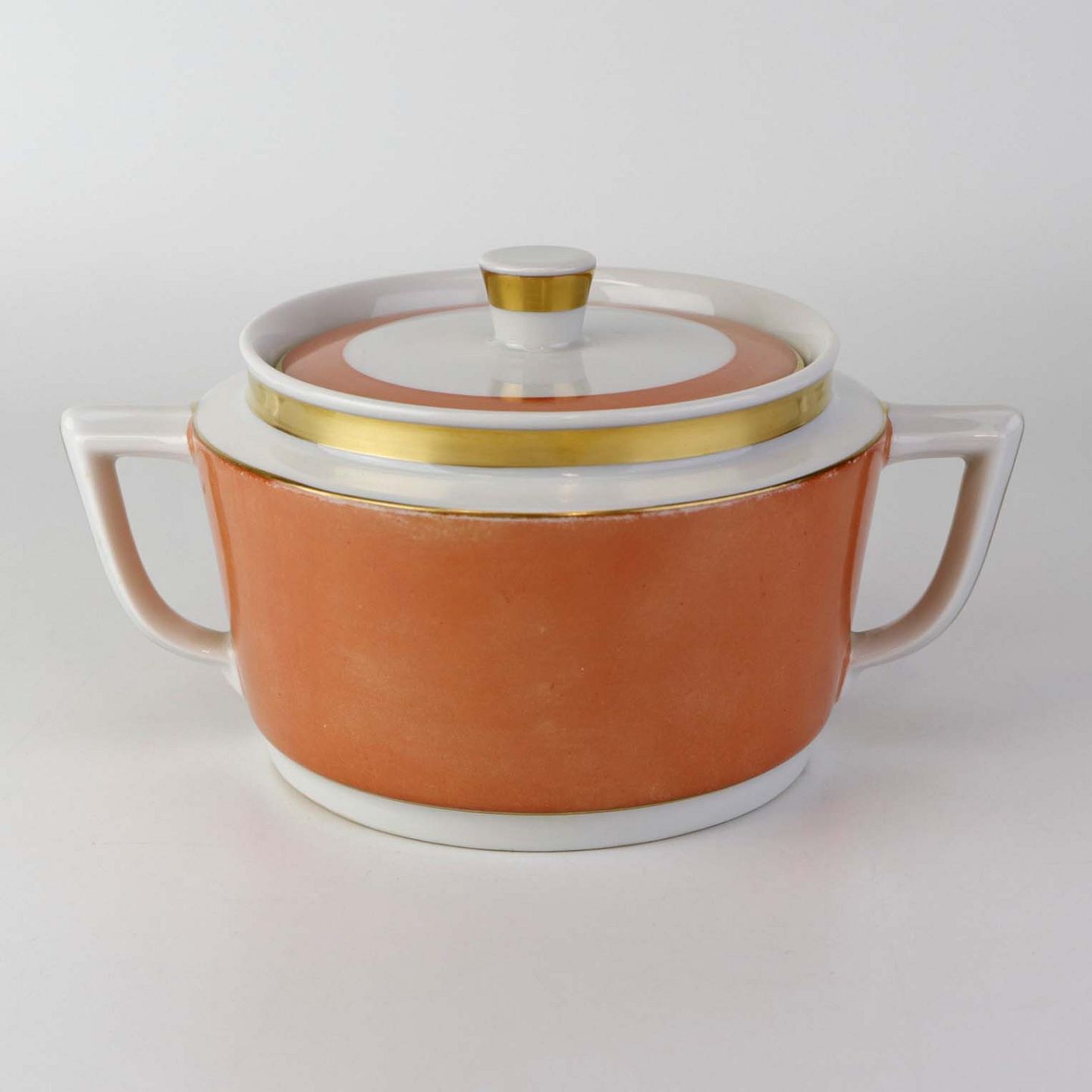 Service i glat hvidt porcelæn med orangerød dekoration over glasuren og guldkant