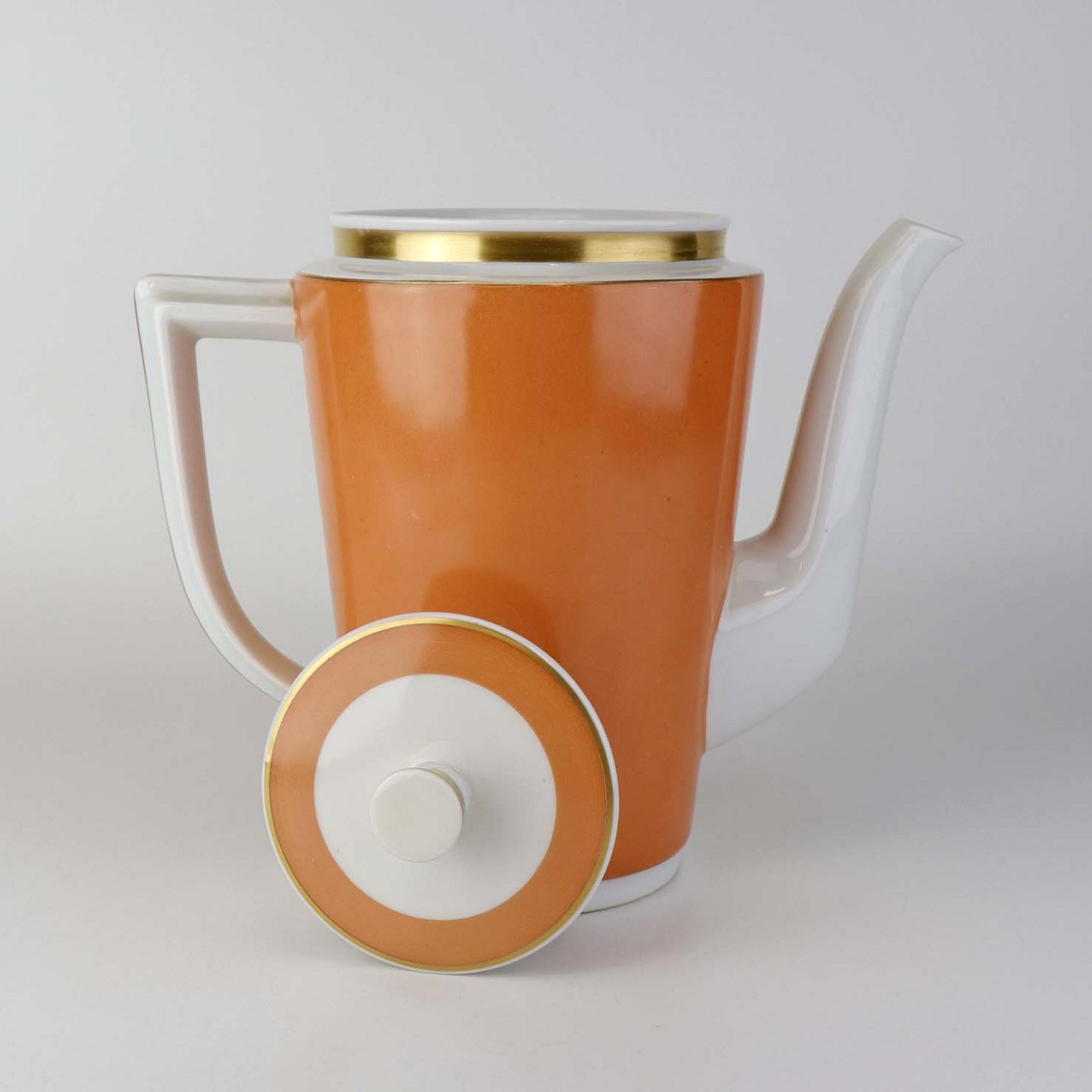 Service i glat hvidt porcelæn med orangerød dekoration over glasuren og guldkant