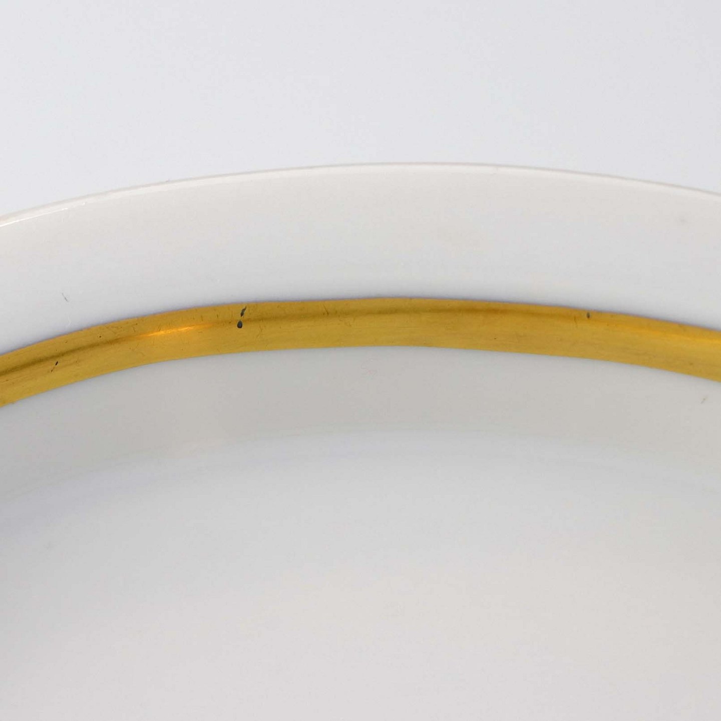 Service i glat hvidt porcelæn med orangerød dekoration over glasuren og guldkant