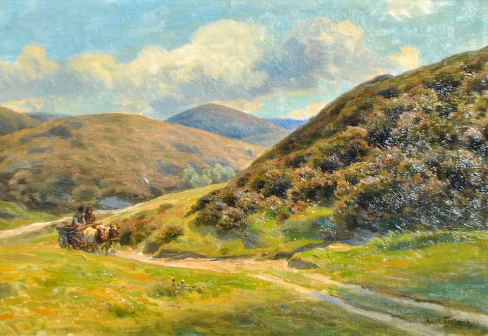 Frederiksen, Axel (1881 - 1961) Dänemark: Ein Ochsenkarren in Rebild Bakker. Öl auf Leinwand. Unterzeichnet. 50 x 70 cm.Gerahmt: 65 x 88 cm.