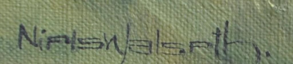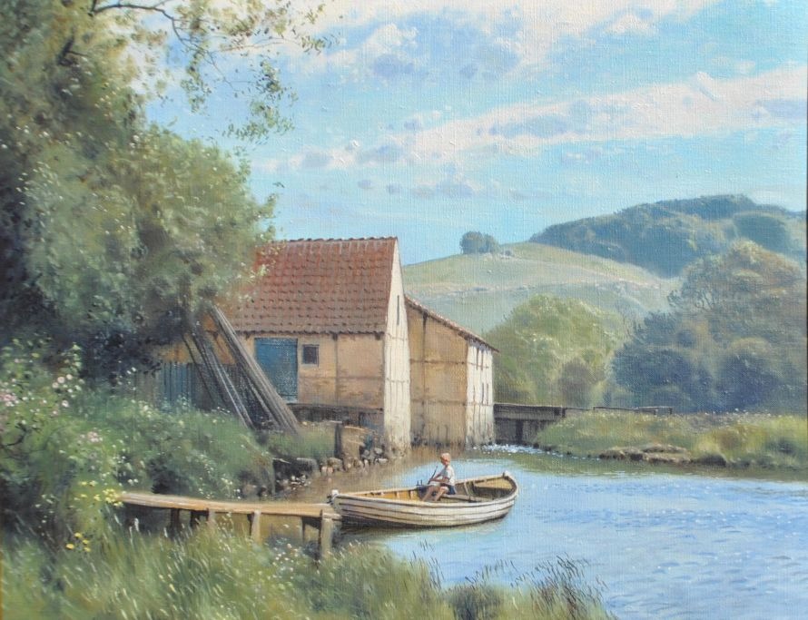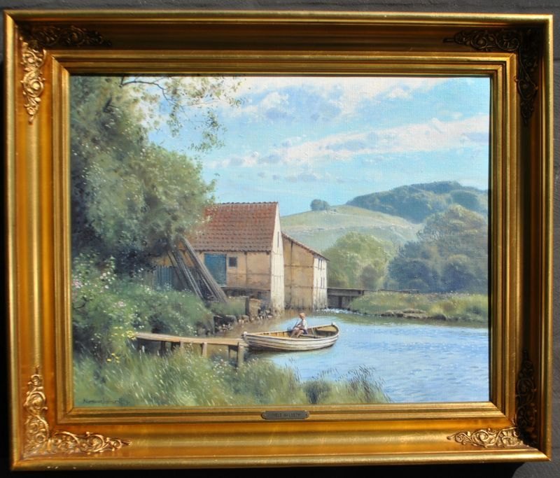 Walseth, Niels (1914 - 2001) Dänemark: Ein Junge in einem Ruderboot auf einem Mühlsee. Öl auf Leinwand. Signiert. 40 x 50 cm.Gerahmt in einem vergoldeten Rahmen mit Eckornament: 50 x 60 cm.