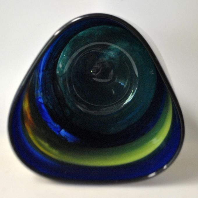Nemtoi, Ioan (1964 - ) Rumänien: Glasvase in dreieckiger Form. Glas in Blau und Grün mit gelben, orangefarbenen und schwarzen Wirbeln. Signiert. H: 21,5 cm. B: 19 cm.Bestellnummer: 28223