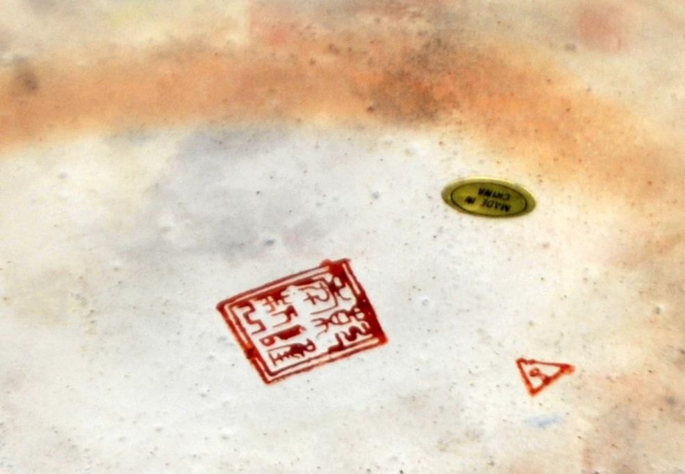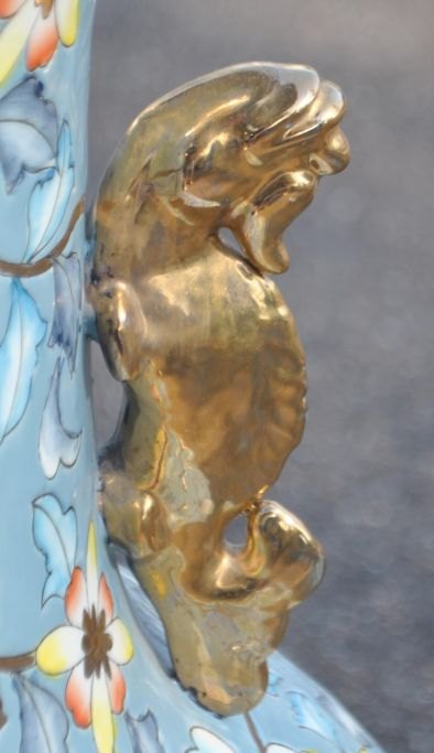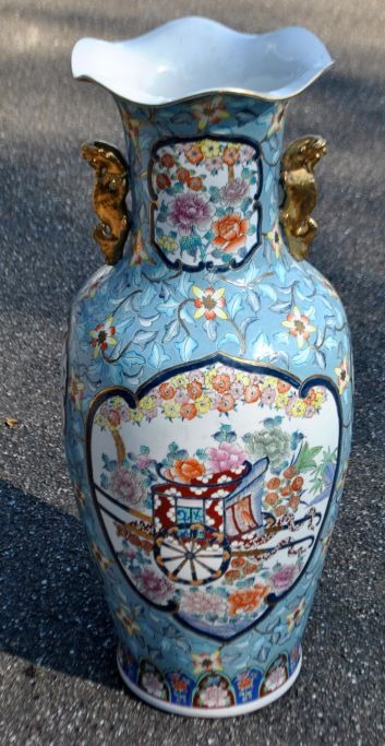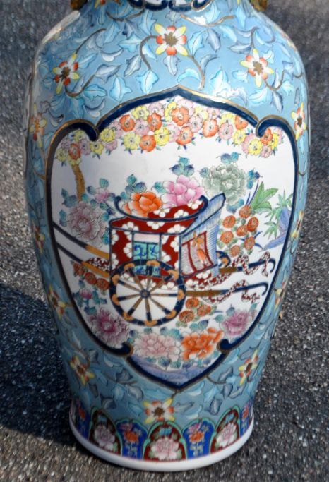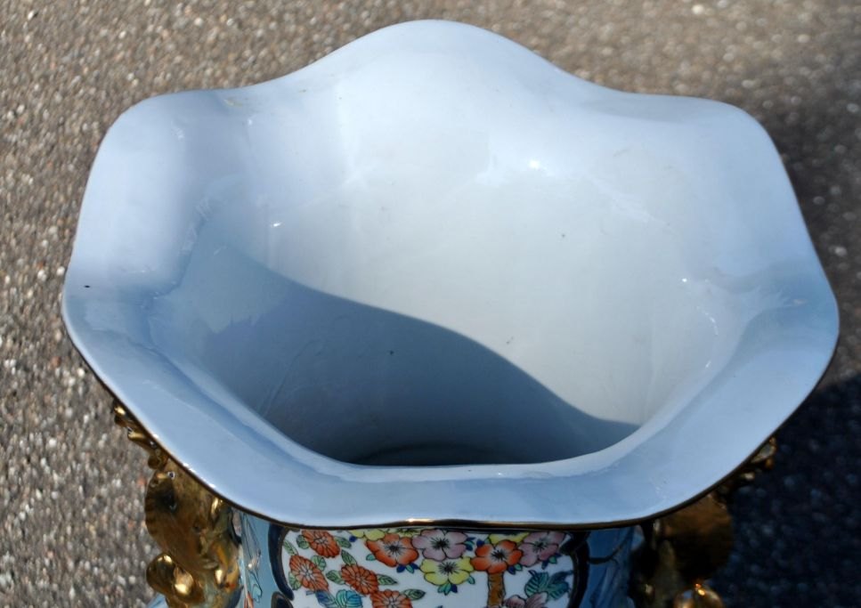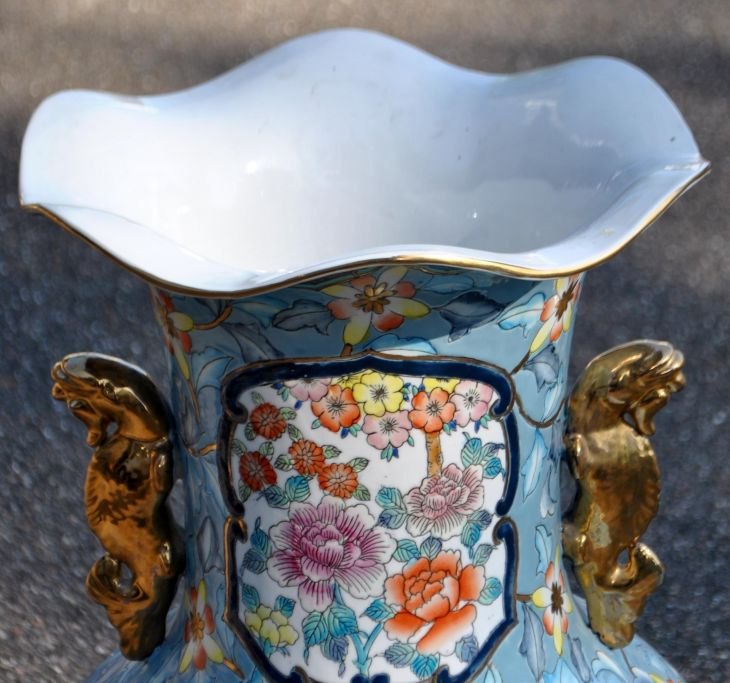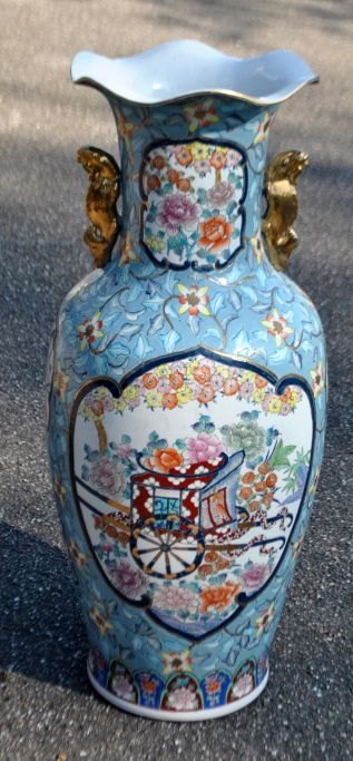 Große chinesische Bodenvase aus Porzellan, 20. Jahrhundert. Zahlreiche polychrome Dekorationen in Form von Kutschen mit Blumen, Vögeln in Blumenbüschen usw. Vergoldete Henkel. Gerüschter Rand. Gestempelt. H.: 81,5 cm.Bestellnummer: 28226