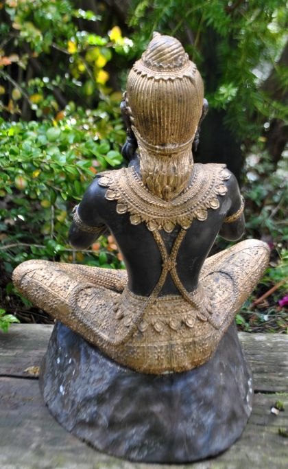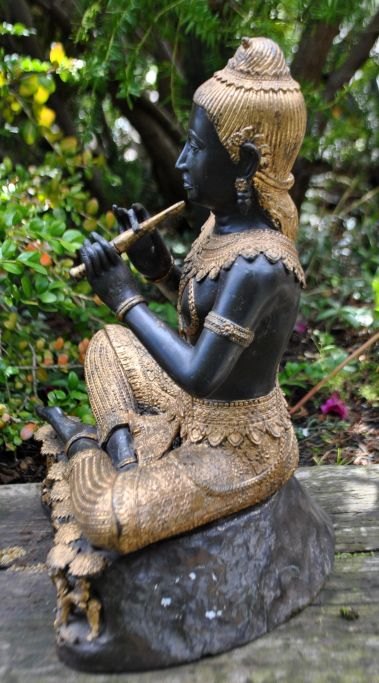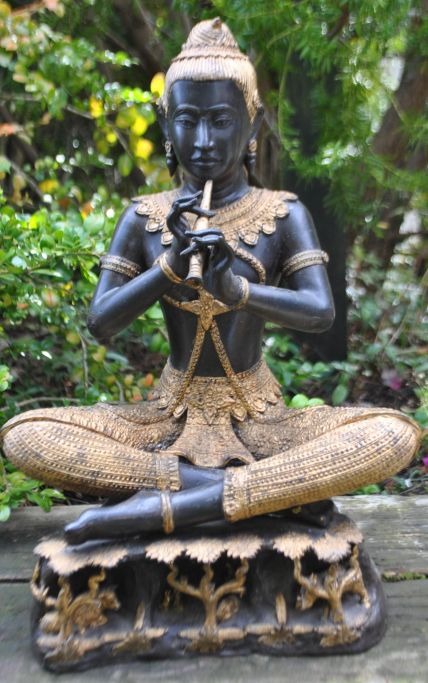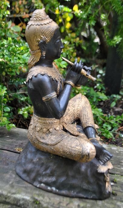 Flötenspielender Templer aus teilweise vergoldeter Bronze, 20. Jahrhundert. Wachs überzogen. Sitzend auf einem Sockel mit Baumschmuck, darunter ein Elefant, Hasen und eine Kuh. H: 36 cm. B: 26 cm. T: 19 cm.Bestellnummer: 28228
