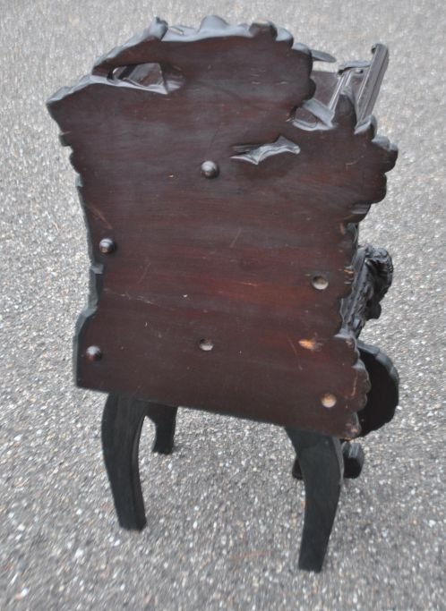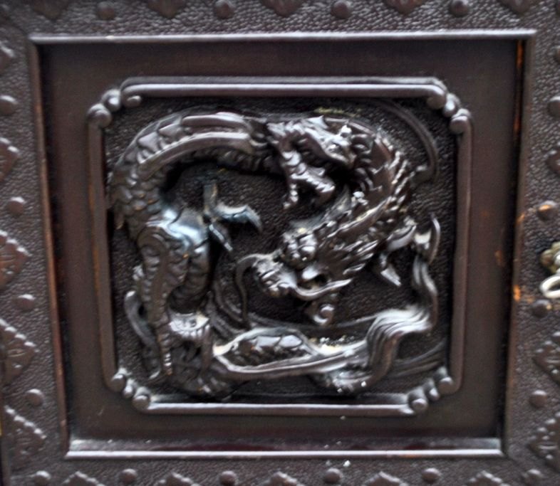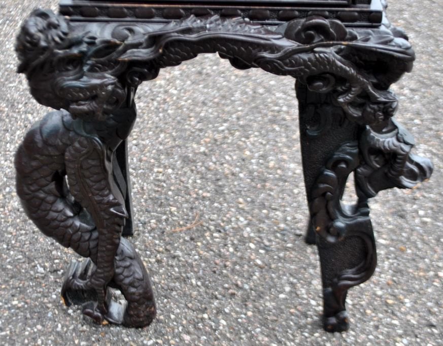 Kleiner chinesischer Briefschrank aus Hartholz, 20. Jahrhundert. Dunkles Holz mit vielen geschnitzten Drachen. Innen Briefablage und Schublade. H: 73 cm. B: 39 cm. T: 28 cm.Bestellnummer: 28234