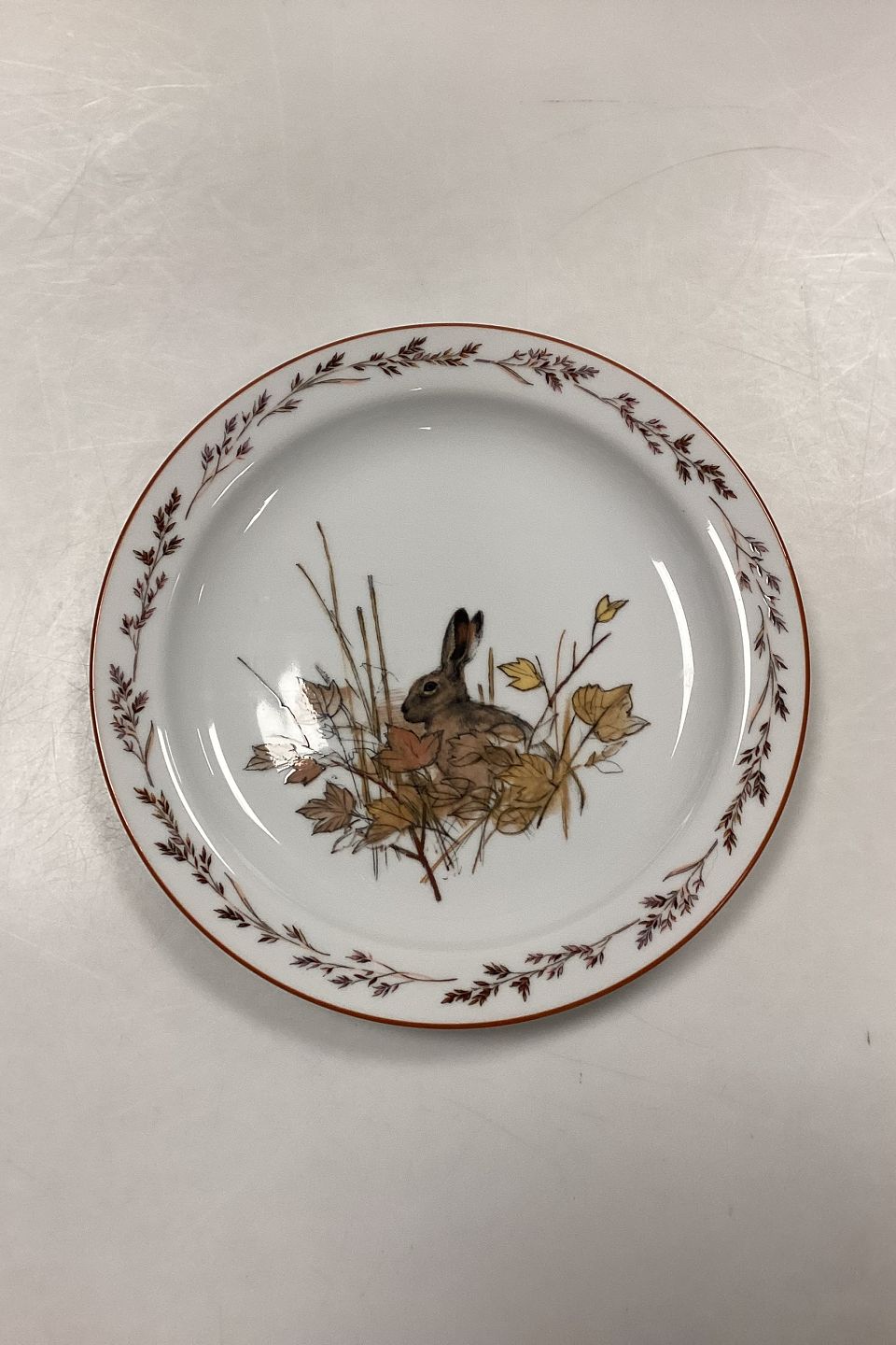 Mads Stage Jagtstellet Frokosttallerken. Producent: Seltmann Weiden. Motiv: Hare. Måler 23,5 cm / 9,25 in.